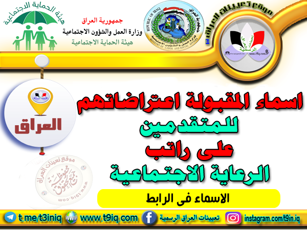 تنفيـذاً لتوجيه وزير العمل رئيس هيئة الحماية الاجتماعية الدكتور باسم عبدالزمان، تعلن هيئة الحماية الاجتماعية إحدى تشكيلات وزارة العمل والشؤون الاجتماعية عن اسماء الاسر المقبولة اعتراضاتها في بغداد والمحافظات البالغ عددها (6325) اسرة وتدعوهم الى البدء بمراجعة اقسام الحماية حسب المواعيد المدرجة مع التفاصيل أدناه :-
