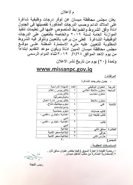 يعلن مجلس محافظة ميسان عن فتح باب التعيين على الدرجة الوظيفية الشاغرة المدرجة في الجدول أدناه :-