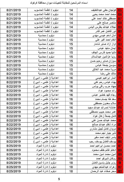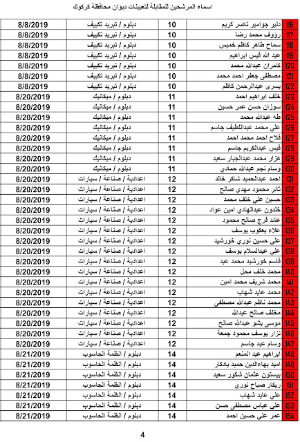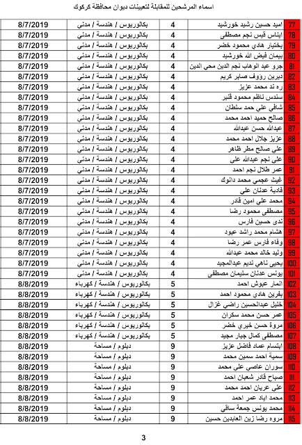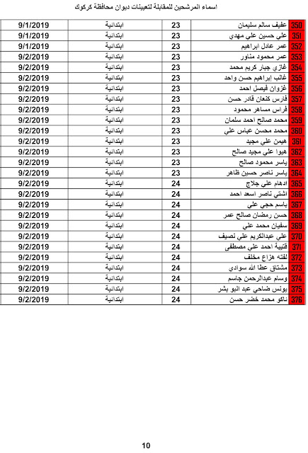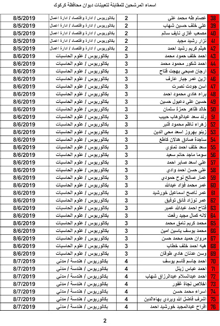 يعلن ديوان محافظة كركوك عن اسماء المدعوين للمقابلة ( الوجبة الثانية ) المتقدمين على الدرجات الوظيفية لملاك الديوان وكما مدرجة مع المواعيد في الجداول أدناه :-