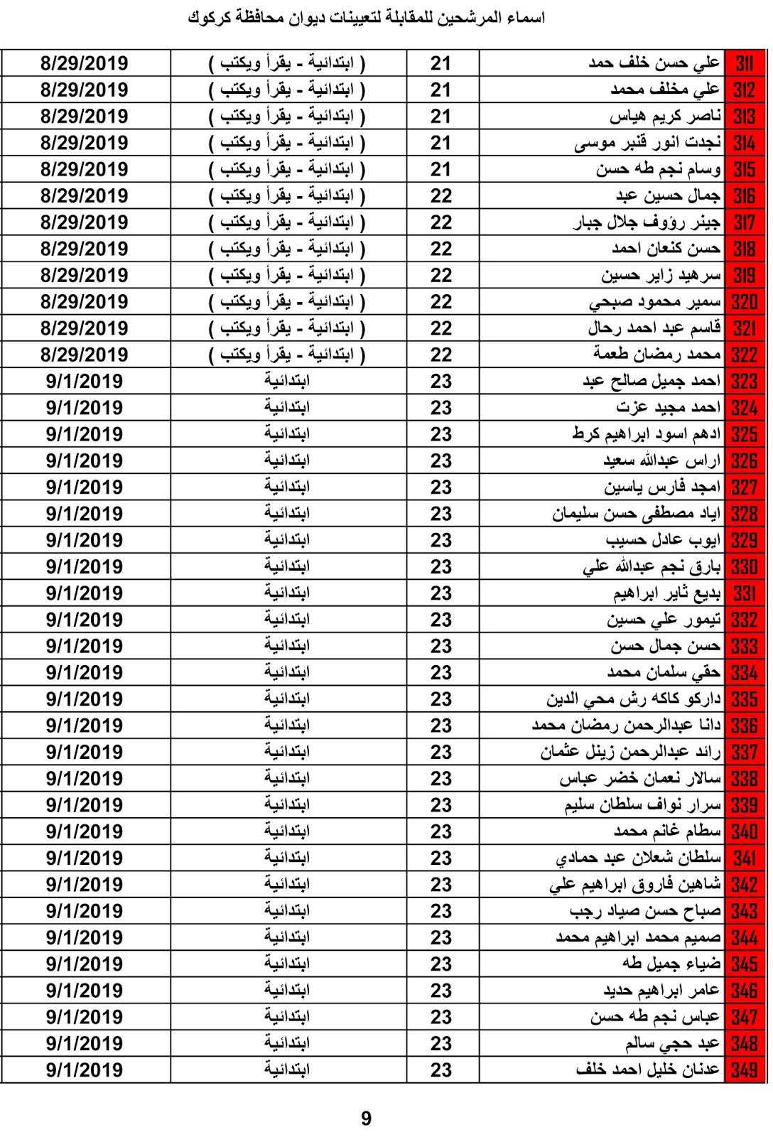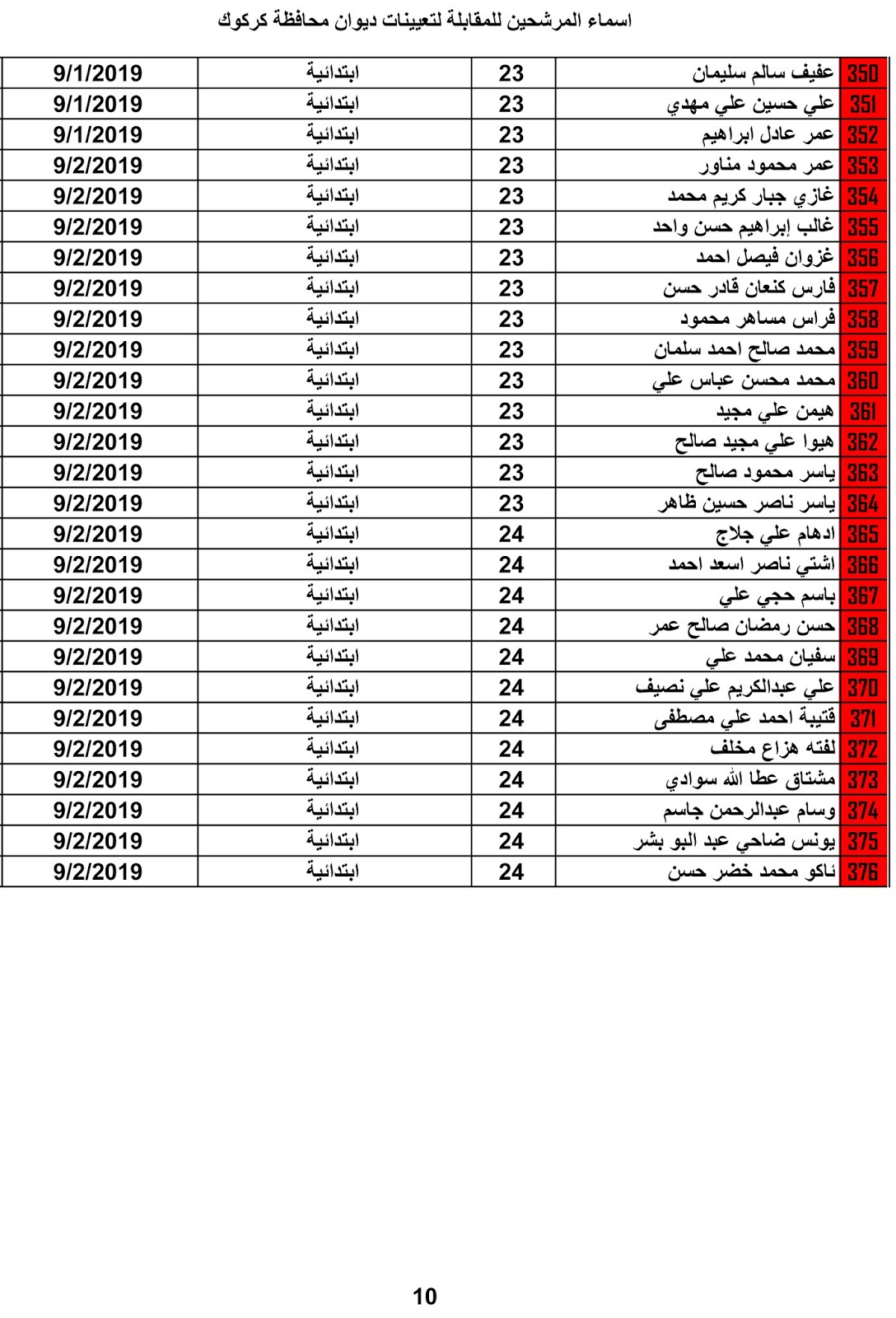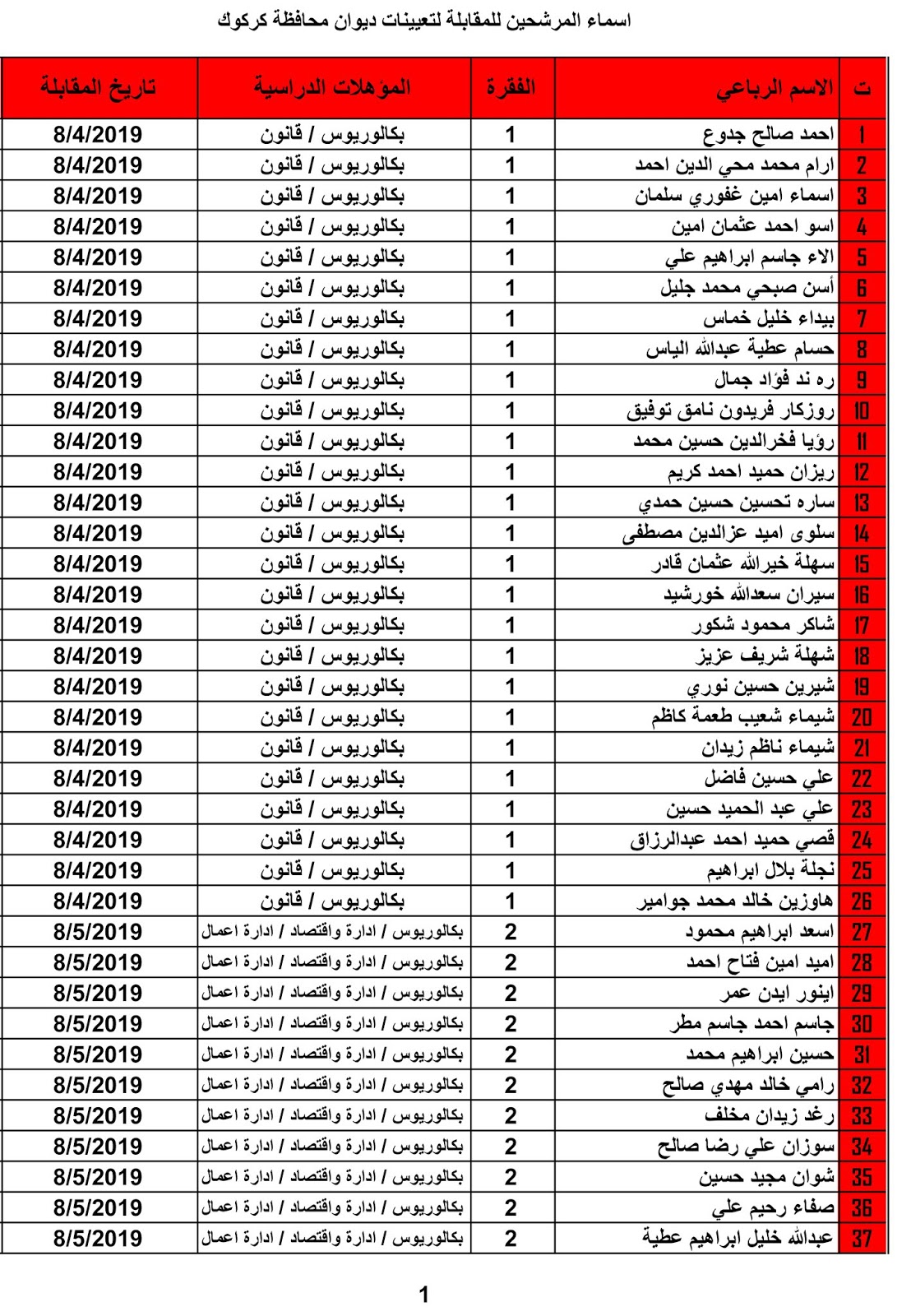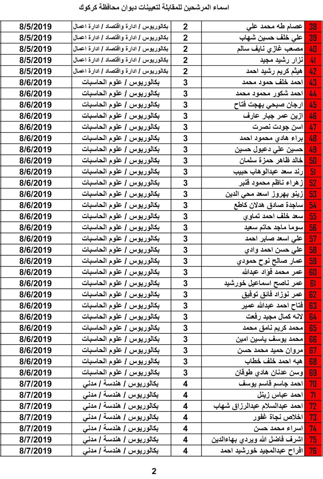 يعلن ديوان محافظة كركوك عن اسماء المدعوين للمقابلة ( الوجبة الثانية ) المتقدمين على الدرجات الوظيفية لملاك الديوان وكما مدرجة مع المواعيد في الجداول أدناه :-