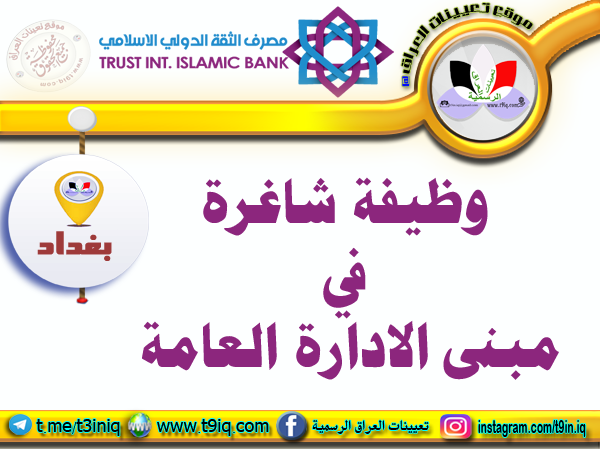يعلن مصرف الثقة الدولي الاسلامي عن توفر وظيفة شاغرة للعمل في مبنى الادارة العامة وفقاً لمعلومات التقديم أدناه :-