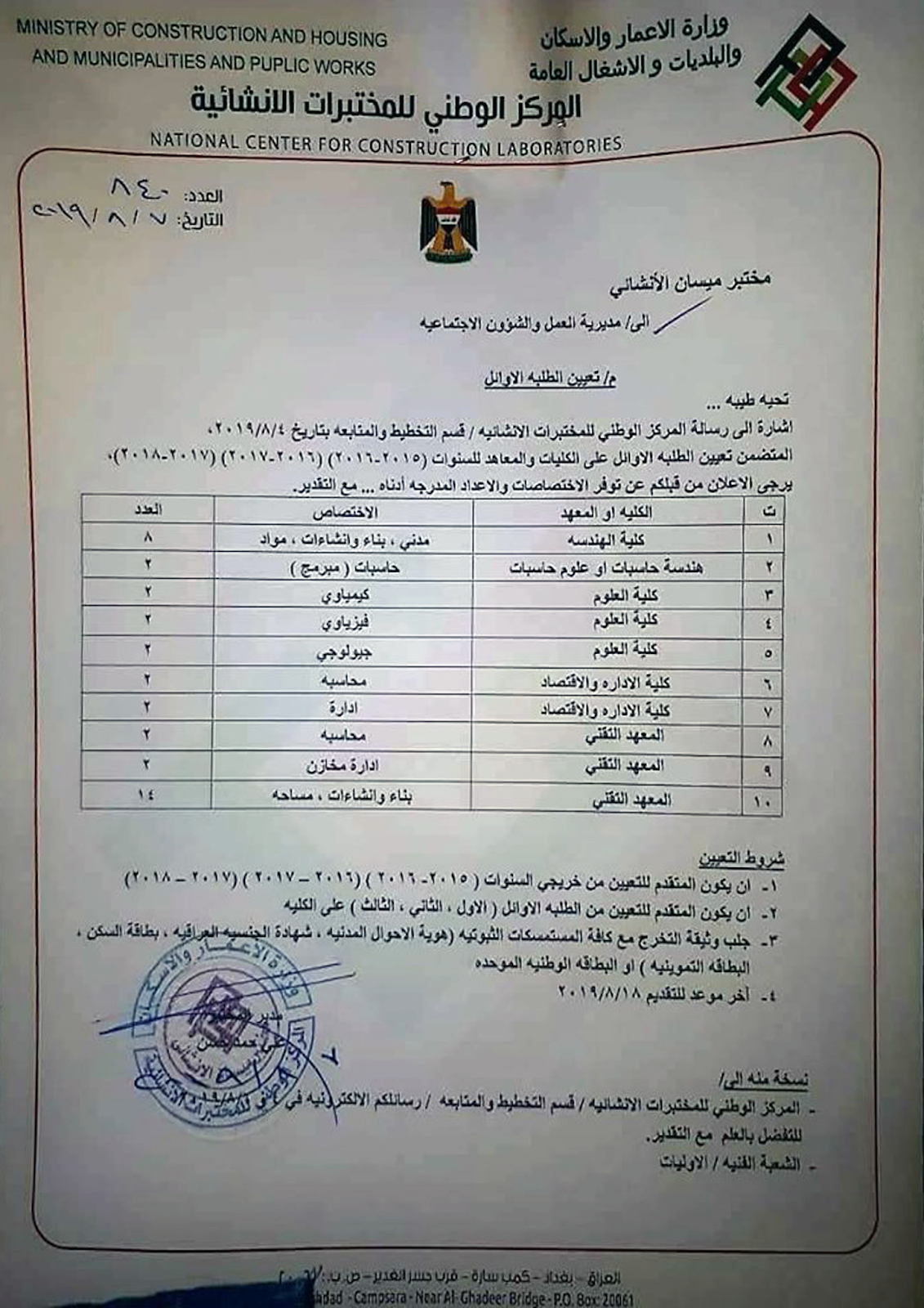 يعلن المركز الوطني للمختبرات الانشائية / ميسان احد تشكيلات وزارة الاعمال والاسكان والبدليات والاشغال العامة عن توفر درجات وظيفية للخريجين الثلاث الاوائل في الكليات والمعاهد وكما مدرجة في المرفق مع التفاصيل أدناه :-