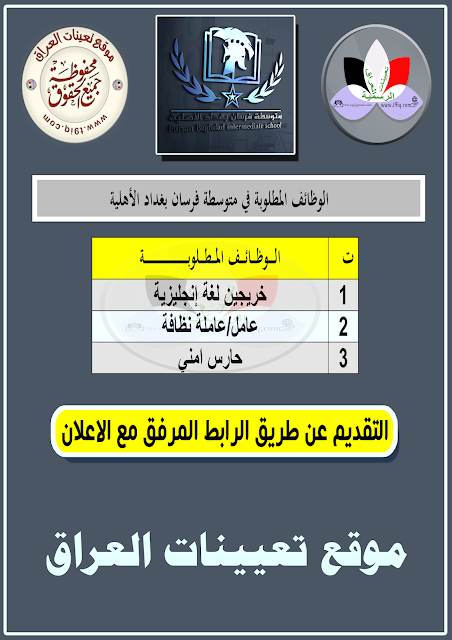 تعلن متوسطة فرسان بغداد الأهلية عن توفر وظائف شاغرة لكلا الجنسين المدرجة في المرفق مع التفاصيل أدناه :-