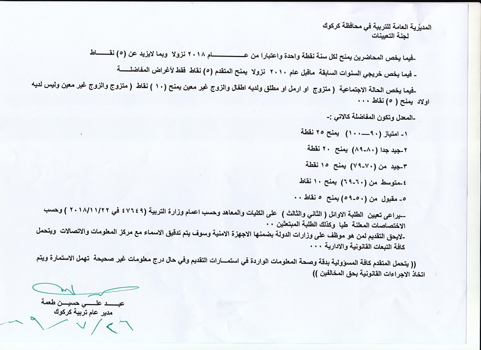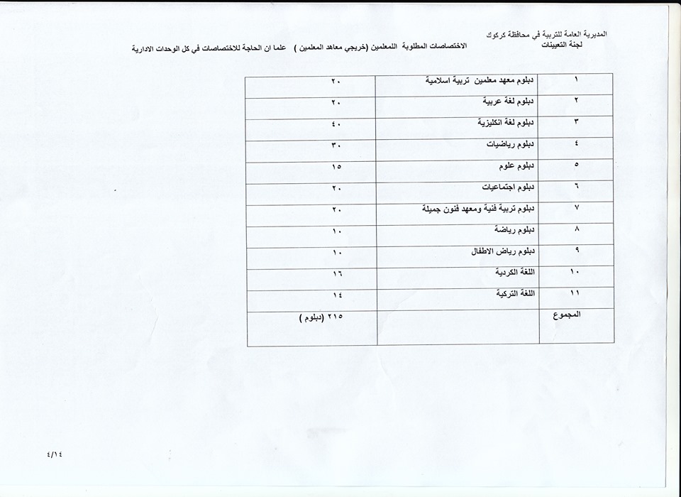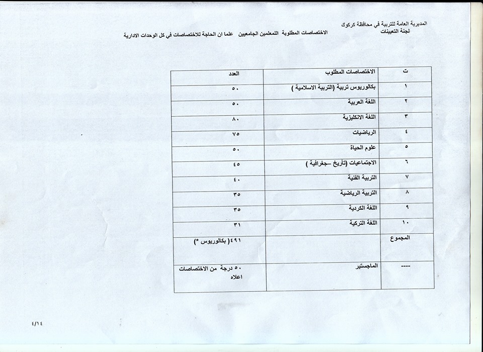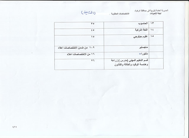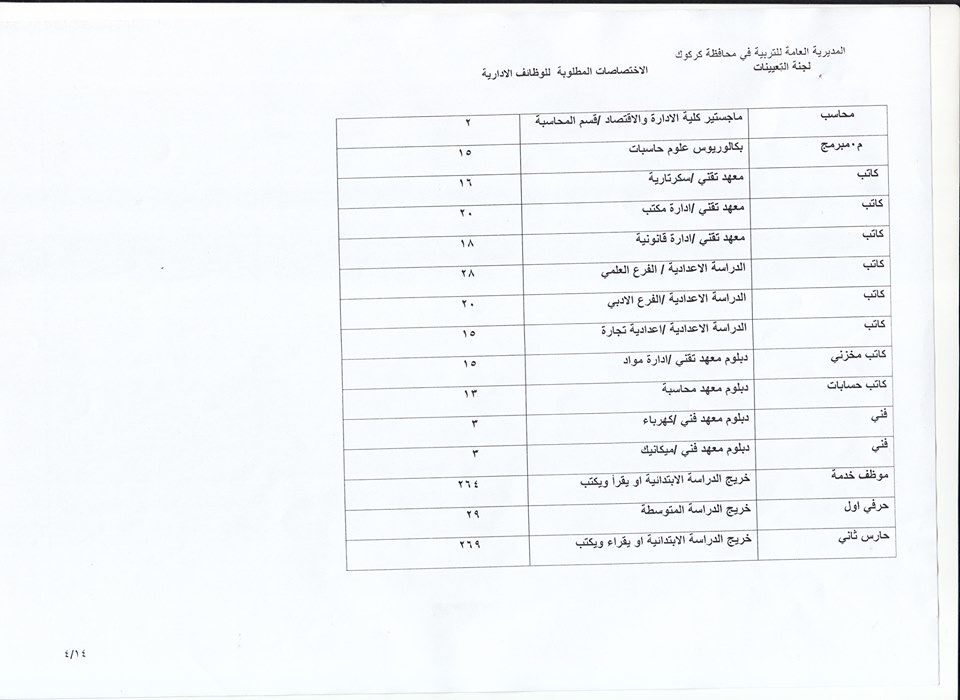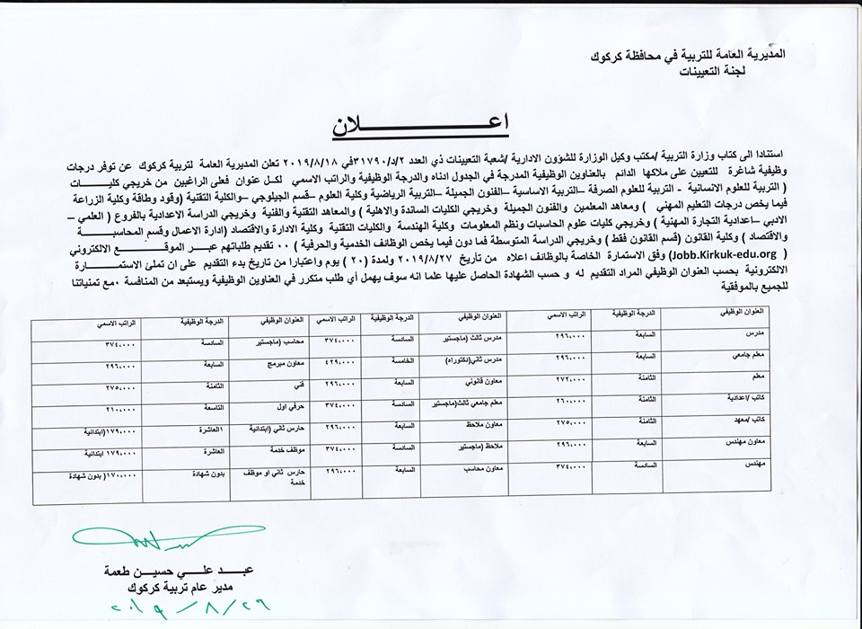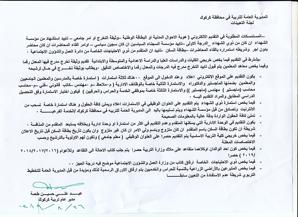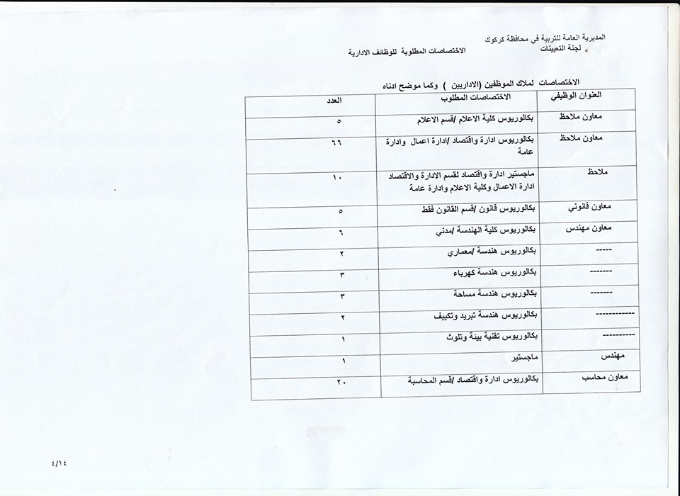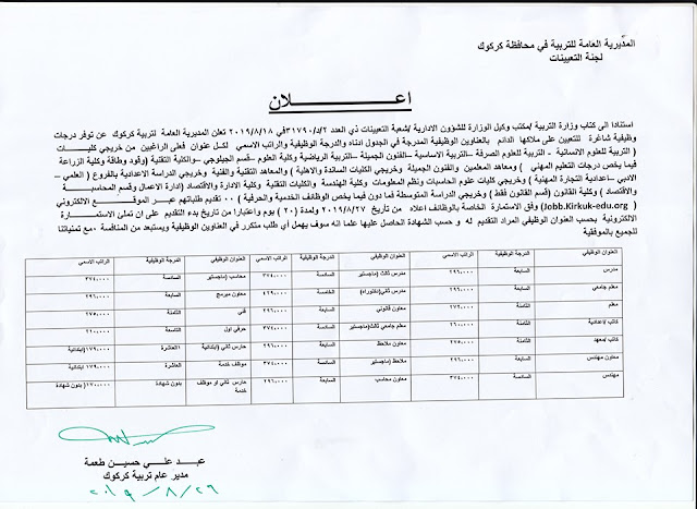 تعلن مديرية تربية كركوك عن فتح باب التعيينات على حركة الملاك للدرجات الوظيفية والشروط والضوابط الموضحة في المرفقات أدناه :-