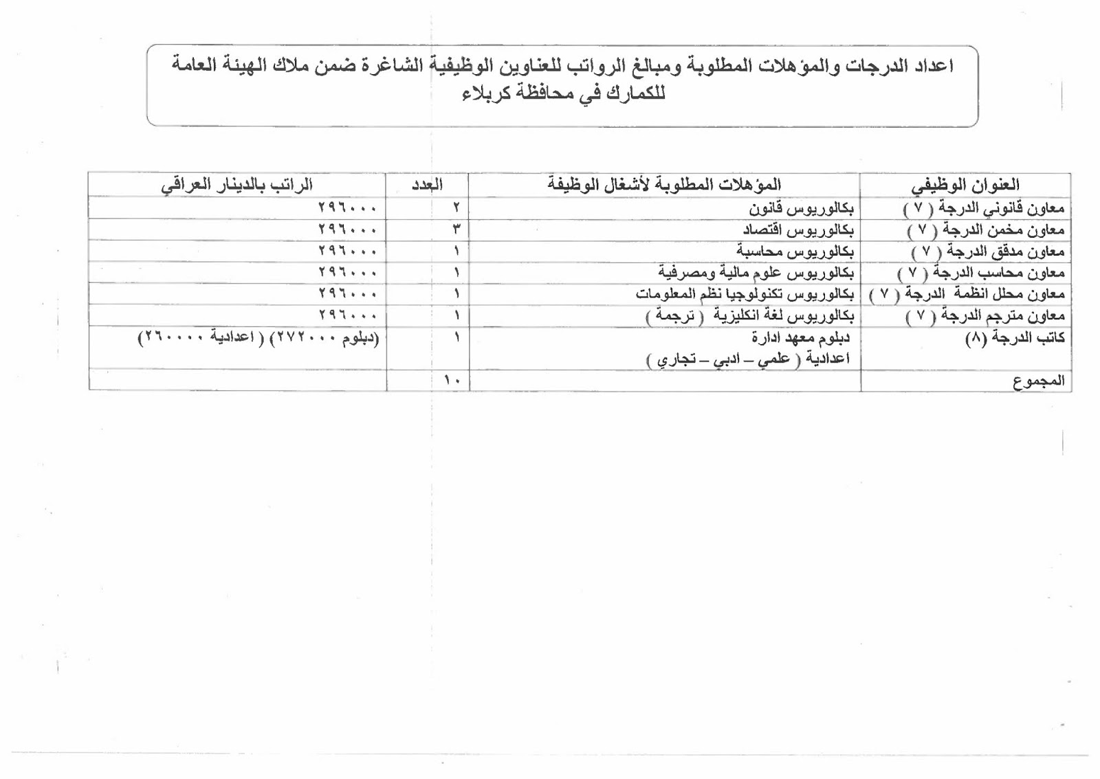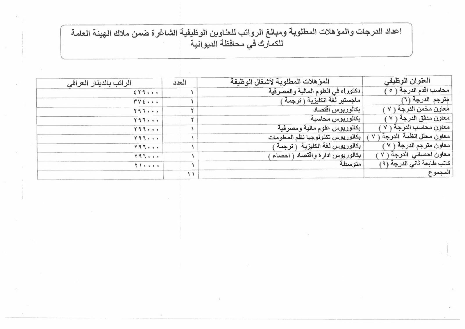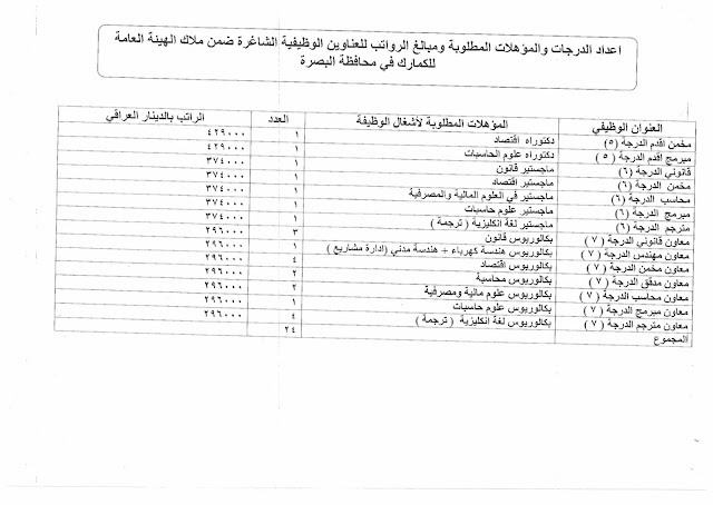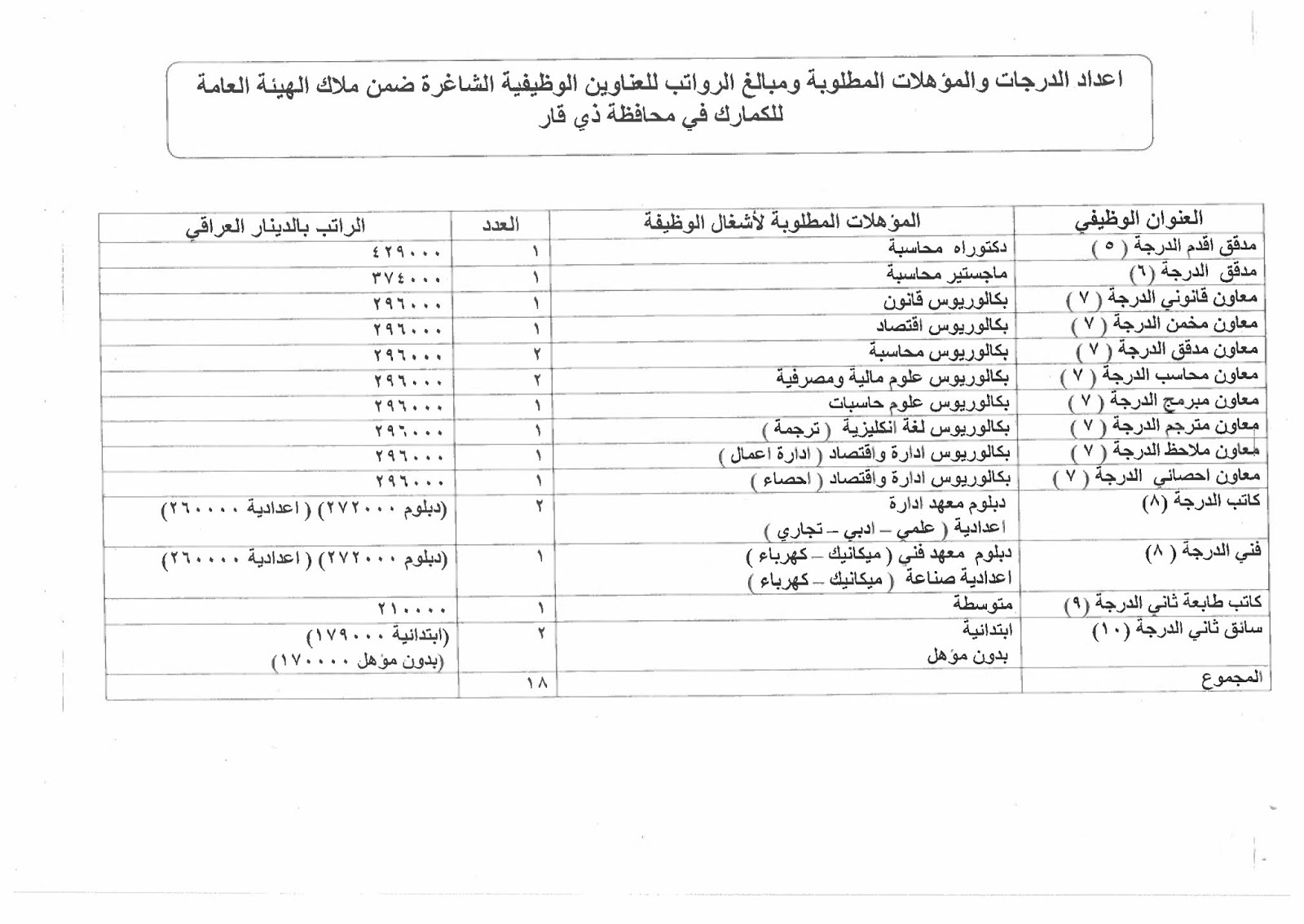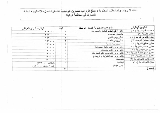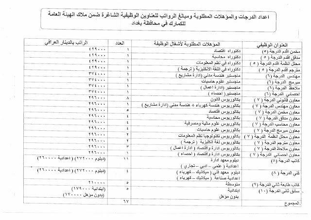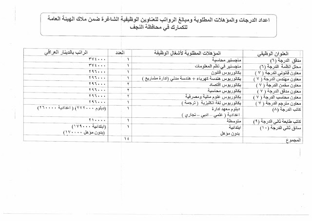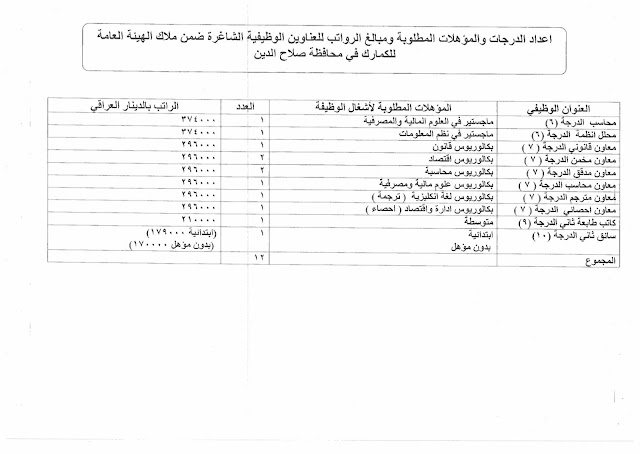 تعلن الهيئة العامة للكمارك عن توفر درجات وظيفية شاغرة ناتجة عن حركة الملاك (موزعة على بغداد والمحافظات) والمدرجة تفاصيلها في المرفقات مع استمارة التقديم والشروط أدناه :-