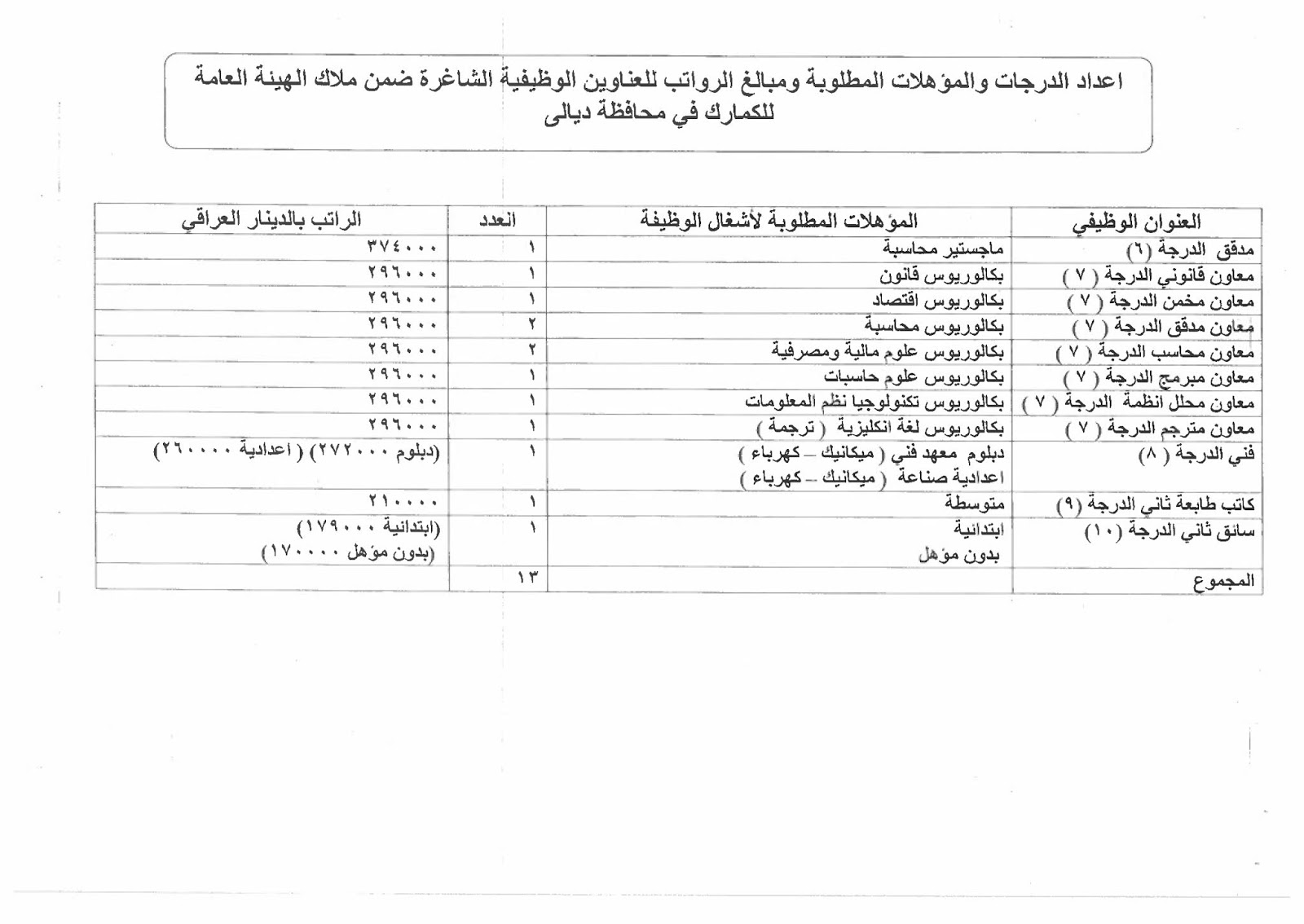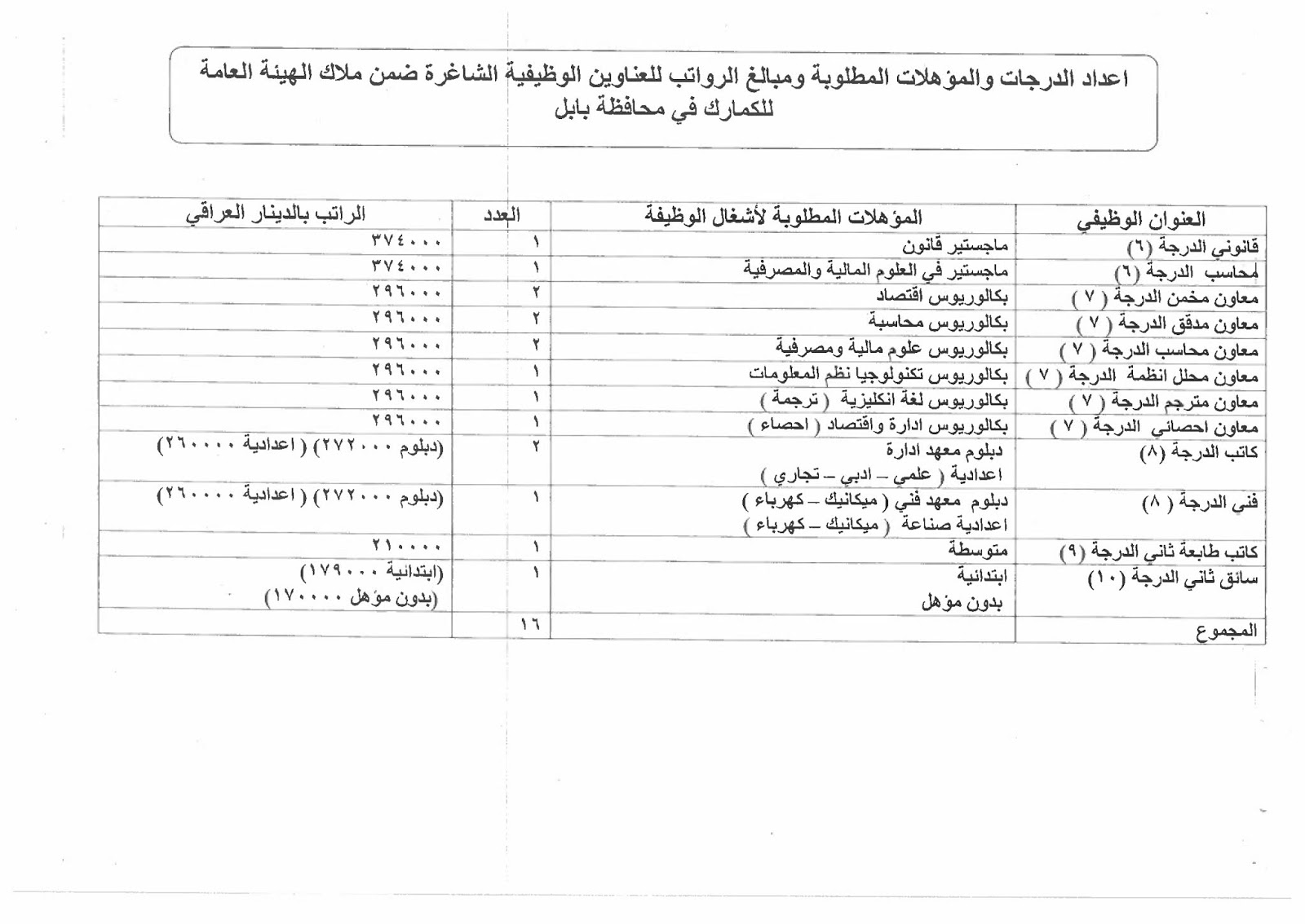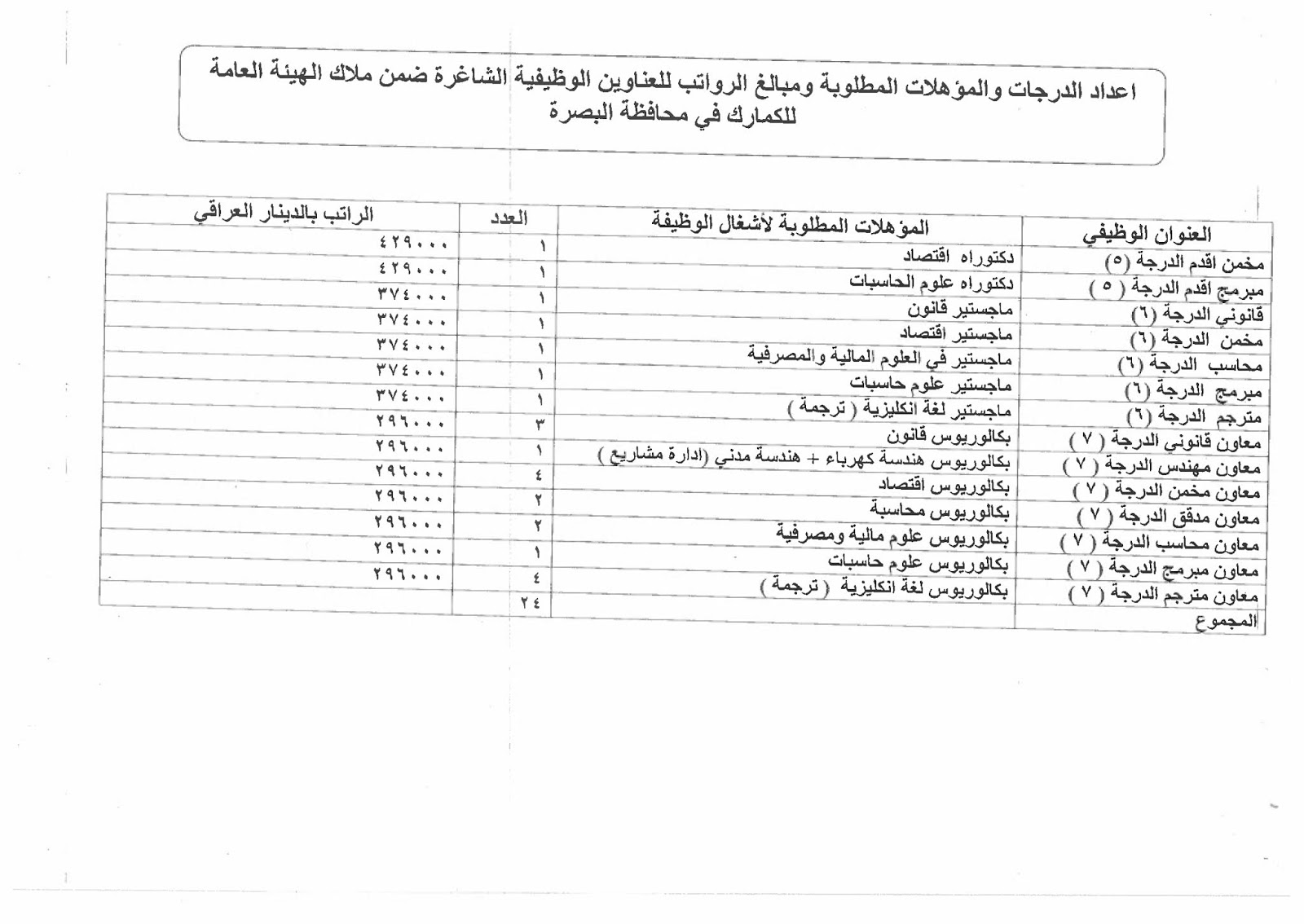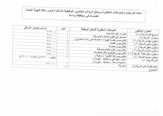 تعلن الهيئة العامة للكمارك عن توفر درجات وظيفية شاغرة ناتجة عن حركة الملاك (موزعة على بغداد والمحافظات) والمدرجة تفاصيلها في المرفقات مع استمارة التقديم والشروط أدناه :-