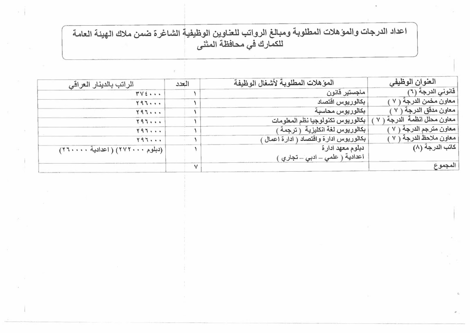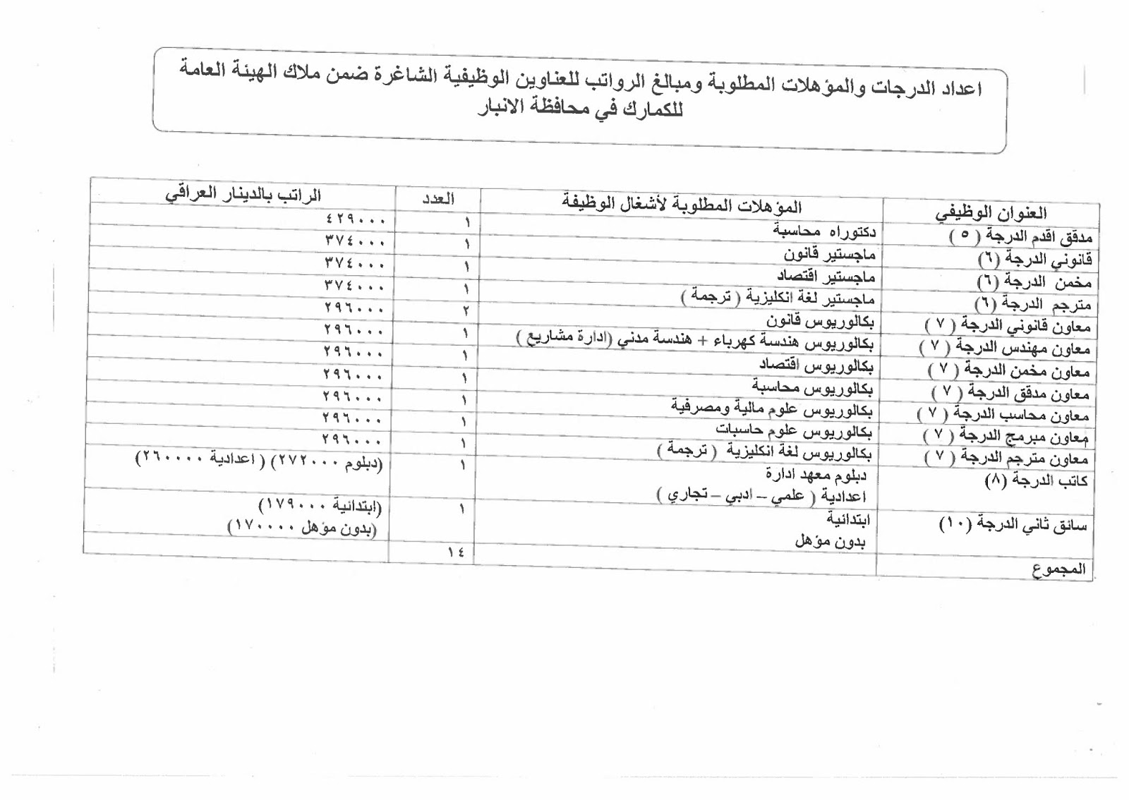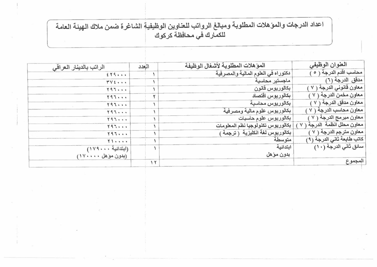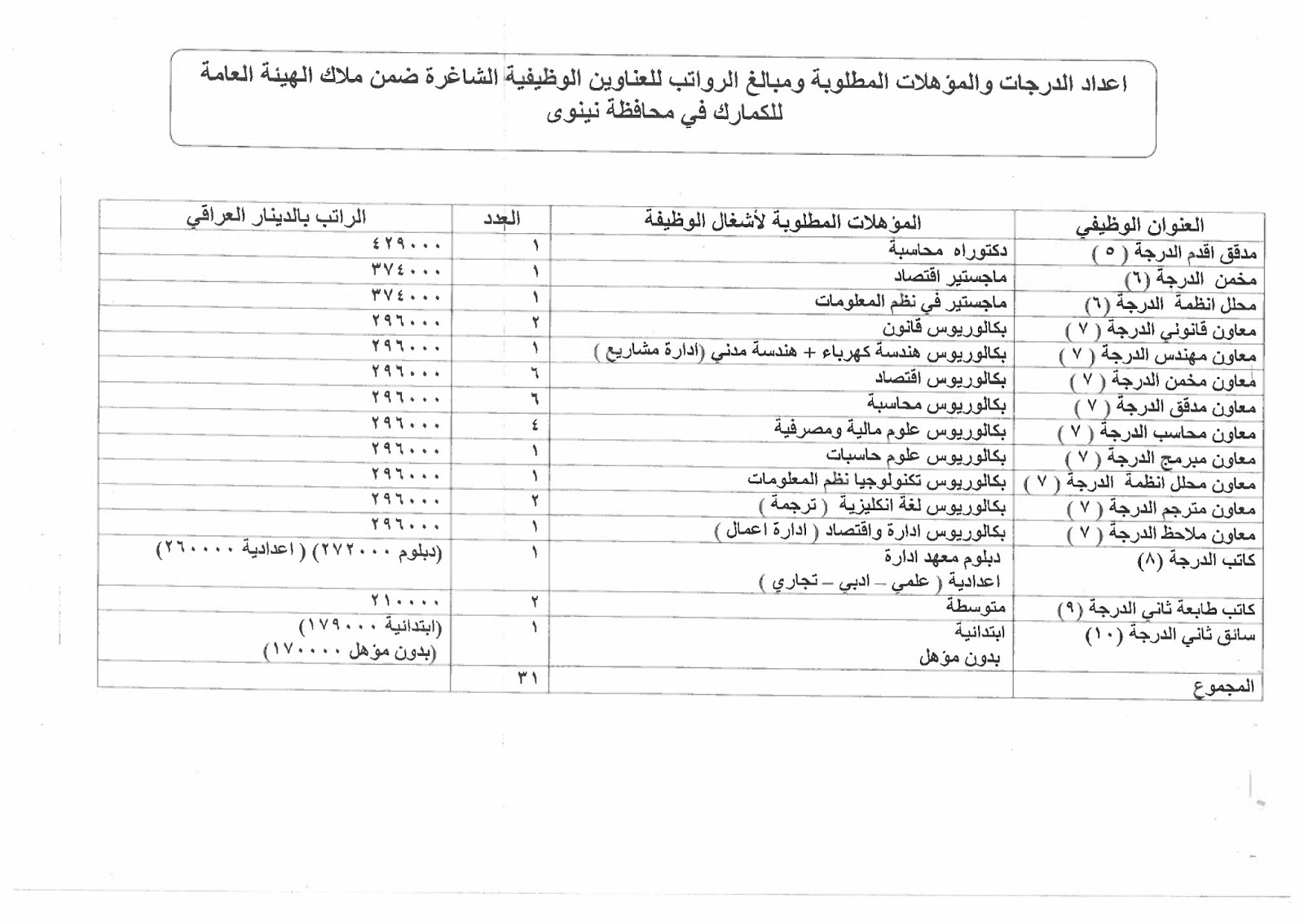 تعلن الهيئة العامة للكمارك عن توفر درجات وظيفية شاغرة ناتجة عن حركة الملاك (موزعة على بغداد والمحافظات) والمدرجة تفاصيلها في المرفقات مع استمارة التقديم والشروط أدناه :-