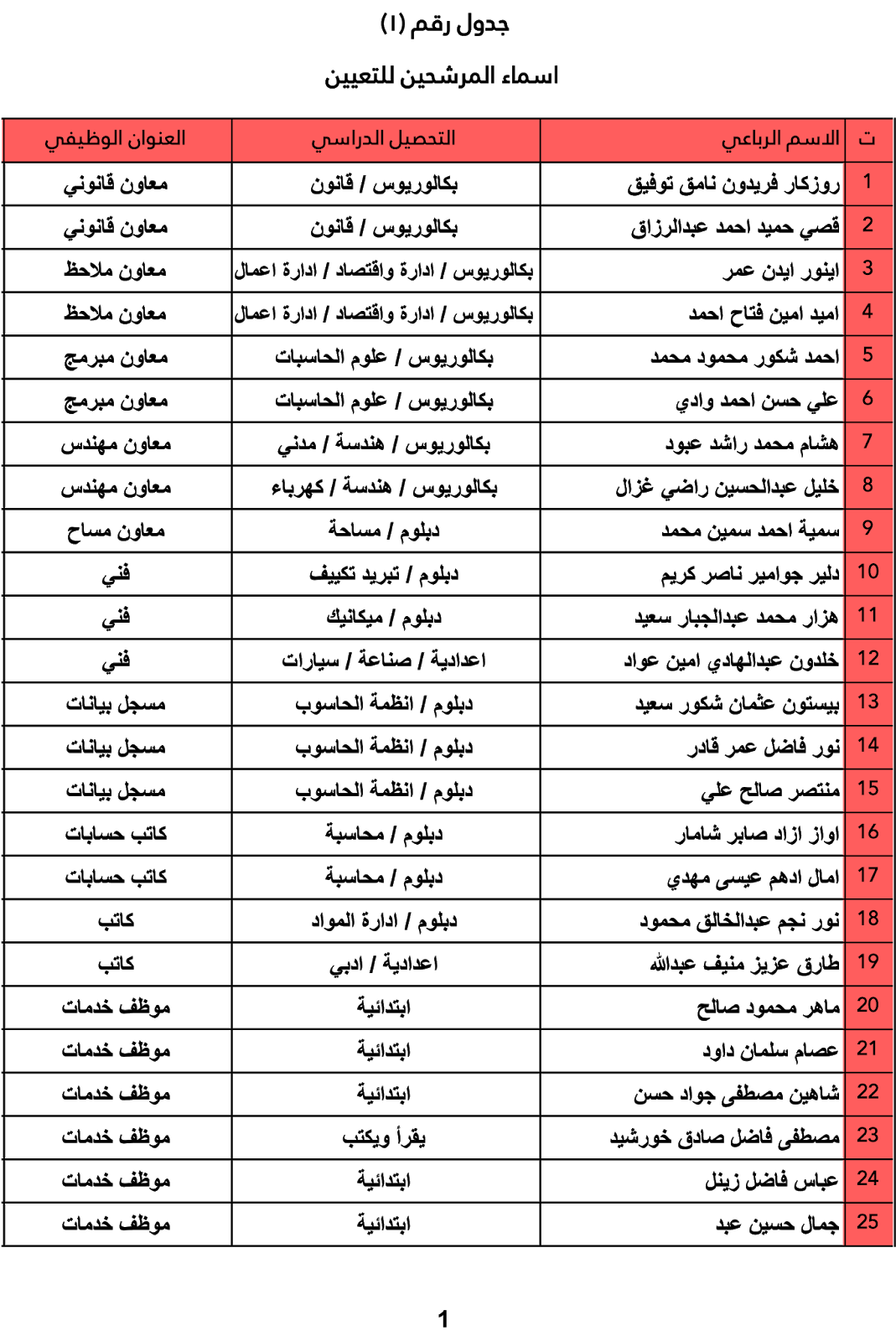 * على الاسماء الواردة بالقائمة الاولى ( المرشحيين للتعيين ) مراجعة ديوان محافظة كركوك / قسم الموارد البشرية لاستكمال اجراءات التعيين خلال مدة زمنية اقصاها ( 10 ) عشرة ايام واعتبارا من يوم الاحد المصادف 2019/9/22 .