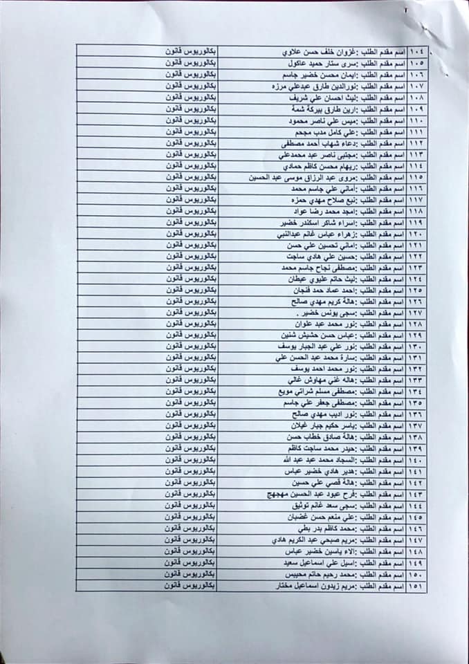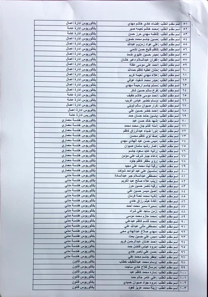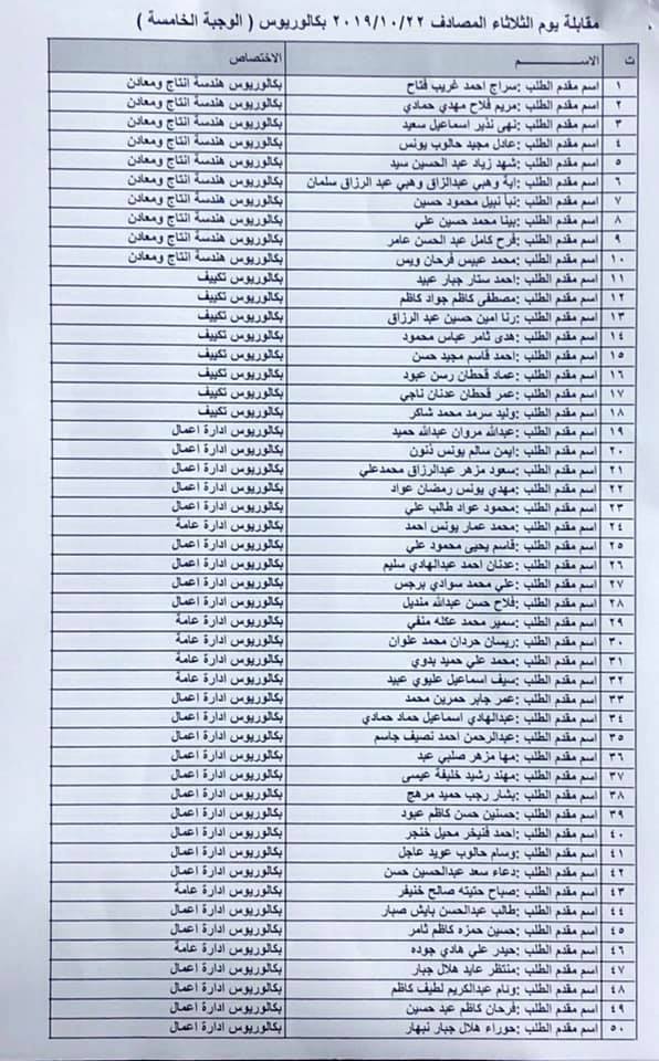تعلن وزارة الاعمار والاسكان والبلديات والاشغال العامة عن اسماء المدعوين للمقابلة ( الوجبة الخامسة ) من حملة شهادة (البكالوريوس) والمدرجة اسماؤهم واختصاصاتهم في الجدول والتفاصيل ادناه :-