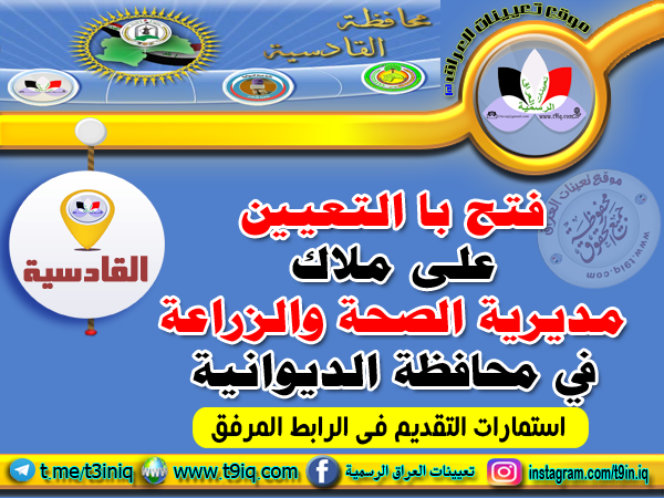 تعلن محافظة عن فتح باب التعيين للدرجات الوظيفية في مديرية زراعة الديوانية والبالغ عددها ( 78 ) درجة وظيفية كمرحلة أولى وفي مديرية صحة الديوانية ( 198 ) درجة وظيفية ولمختلف الاختصاصات على أن يكون التقديم وفق الاستمارات المنشورة في أدناه :-