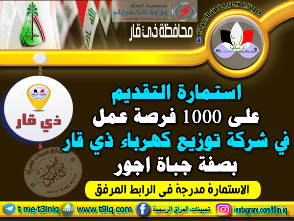 يعلن محافظ ذي قار الدخيلي عن اطلاق استمارة التقديم على 1000 فرصة عمل في مديريات توزيع كهرباء ذي قار بصفة جباة اجور وفقاً للشروط واستمارة التقديم المدرجة أدناه :-
