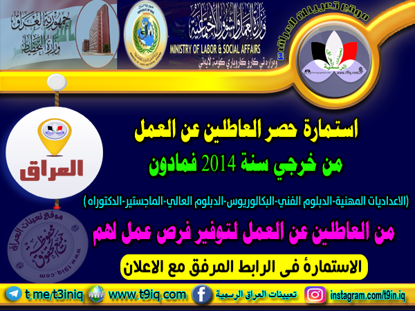 بالتعاون المشترك بين وزارة التخطيط ووزارة العمل ولإجل تكافؤ الفرص في الوظائف الحكومية والعدالة بالتوزيع للخريجين من حملة شهادات الدبلوم المهني (الاعداديات المهنية) والدبلوم الفني، البكلوريوس، الدبلوم العالي، الماجستير، الدكتوراه ولكافة الاختصاصات تطلق استمارة حصر العاطلين عن العمل من خريجي سنة 2014 فما دون لتوفير فرص عمل لهم لضمان ان تكون القاعدة شاملة لجميع الخريجين من سنة 2014 فما دون ولاعمار لاتتجاوز 45 سنة وكما مدرجة ربطاَ أدناه :-