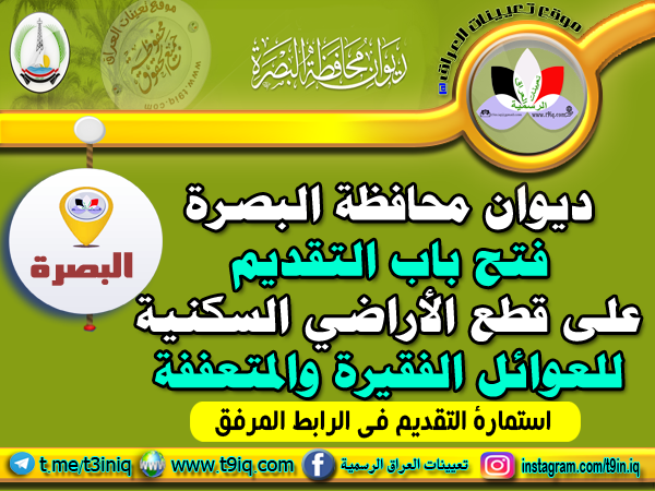 يعلن محافظ البصرة الاستاذ اسعد العيداني عن فتح باب التقديم على قطع الأراضي السكنية للعوائل الفقيرة والمتعففة وفقاً للأستمارة الالكترونية المدرجة ربطاً أدناه :-