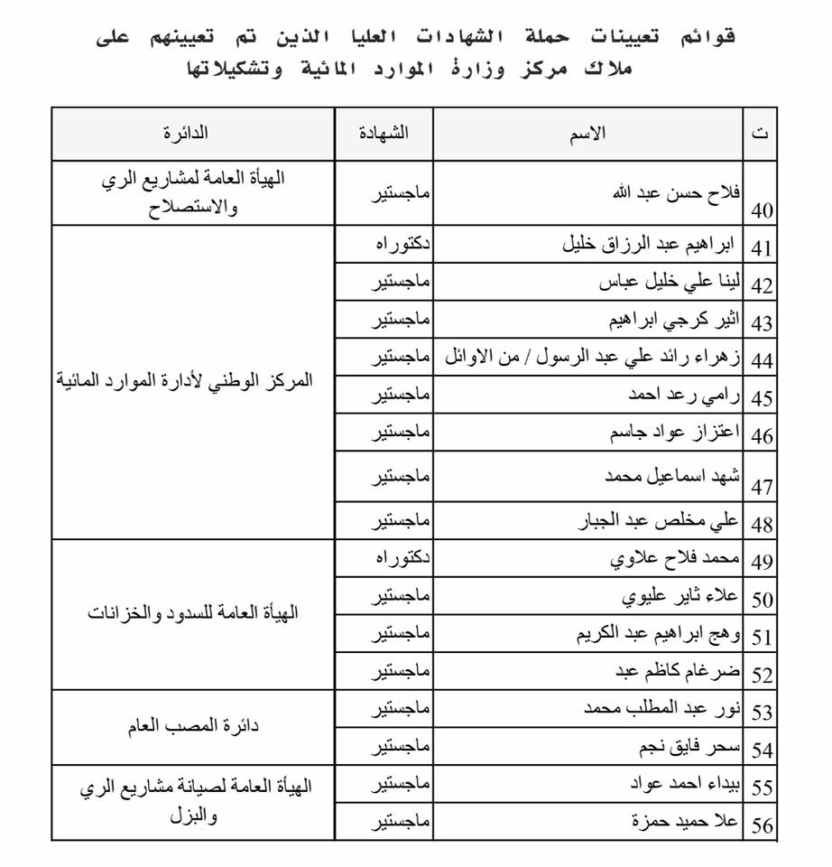 تعلن وزارة الموارد المائية عن اسماء المعينين من حملة الشهادات العليا على ملاك الوزارة وكما مدرجة في القوائم أدناه :-