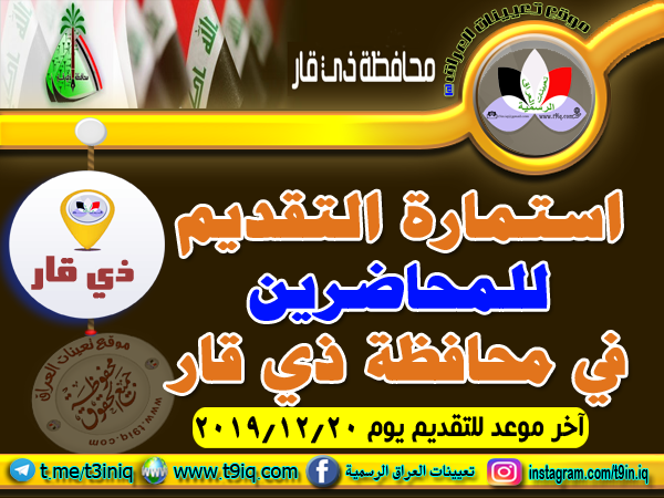 يسر مديرية تربية محافظة ذي قار ان تعلن عن فتح باب التقديم لخريجي الكليات والمعاهد للعمل كمحاضر بعنوان (معلم ــ مدرس ــ معلم جامعي ــ مرشد تربوي) ووفق الشروط والضوابط واستمارة التقديم المدرجة أدناه :-