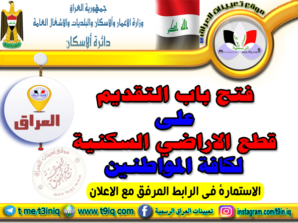 اعلن وزير الاعمار والاسكان والبلديات العامة السيد بنكَين ريكاني عن فتح باب التقديم على قطع الاراضي السكنية لكافة المواطنين وفقاً للمعلومات والاستمارة الالكترونية المدرجة أدناه :-