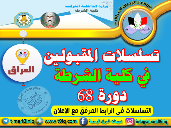تعلن وزارة الداخلية / مديرية ادارة التطوع عن تسلسلات الطلبة المقبولين في كلية الشرطة دورة 68 وكما مدرجة مع التفاصيل في الجدول أدناه :-