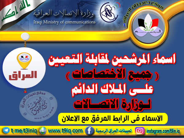 تعلن وزارة الاتصالات عـن اسماء المرشحين لمقابلة التعيين لجميع الاختصاصات على الملاك الدائم لوزارة الاتصالات وكما مدرجة ربطاً مع مواعيد المقابلة أدناه :-