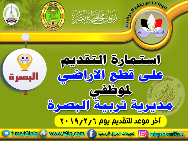 تدعو المديرية العامة للتربية في محافظة البصرة منتسبيها كافة ( ومن ضمنهم التعيين الجديد ) للتقديم على قطع الاراضي عبر الرابط ادناه بعد قراءة جميع التعليمات الواردة ادناه :-