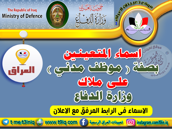 تعلن وزارة الدفاع عن اسماء الذين تم تعيينهم بصفة ( موظف مدني ) ( جميع الوجبات ) على ملاك وزارة الدفاع المدرجة في القوائم ربطاً وحسب مكان تنسيبهم مع موعد المراجعة الخاصة بالتعيين :-