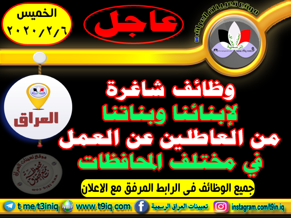 يعلن موقع تعيينات العراق عن مجموعة من وظائف شاغرة وفرص عمل لإبنائنا وبناتنا من العاطلين عن العمل في مختلف المحافظات وكما مدرجة مع روابط التقديم أدناه :-