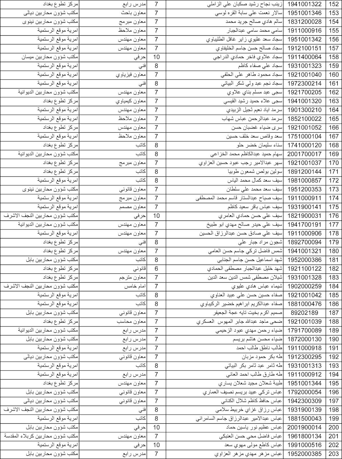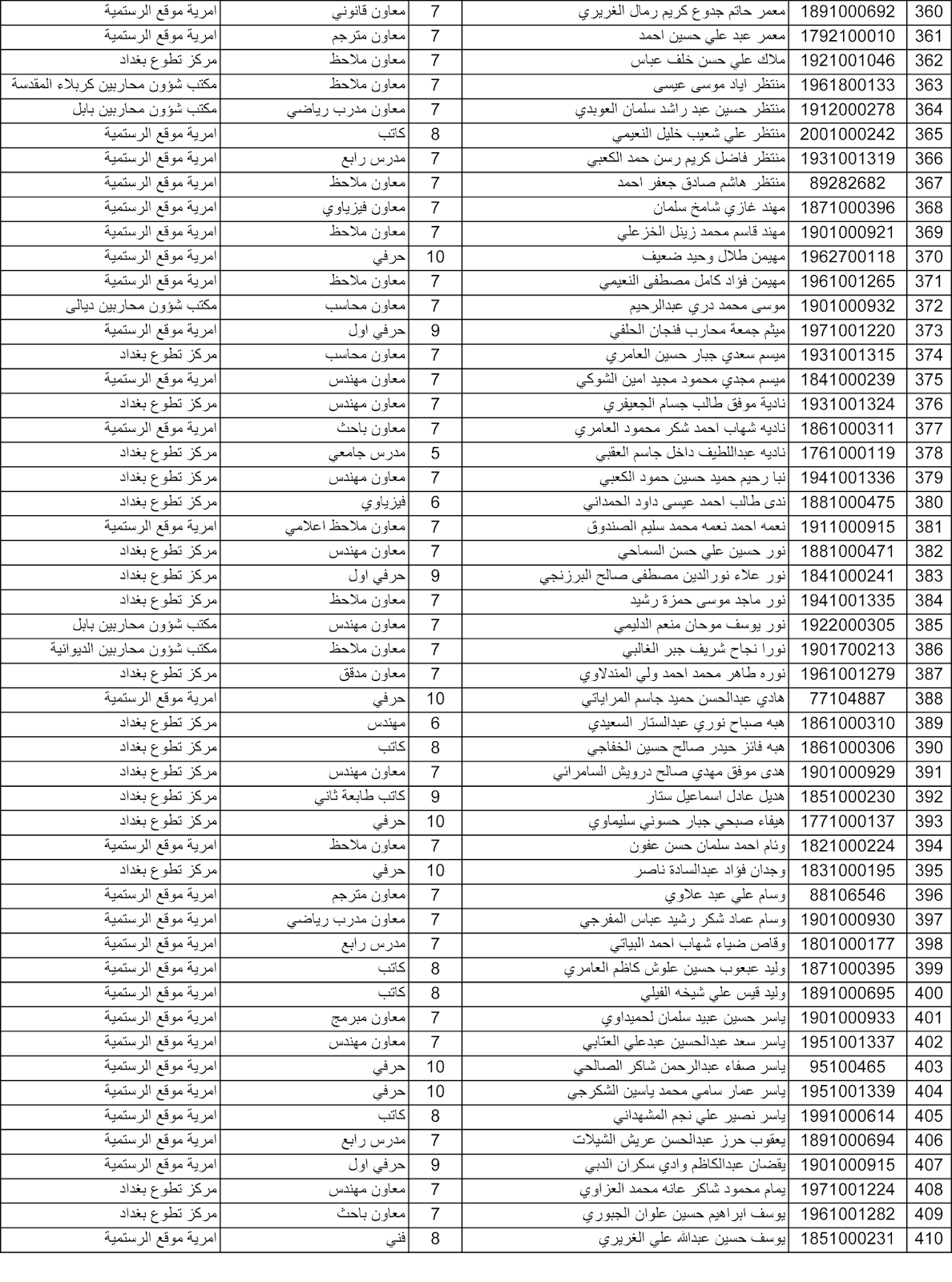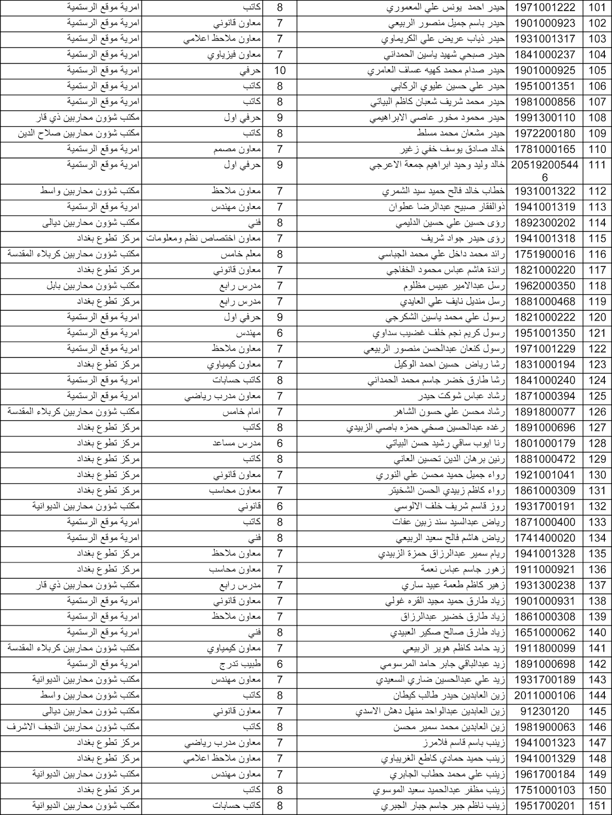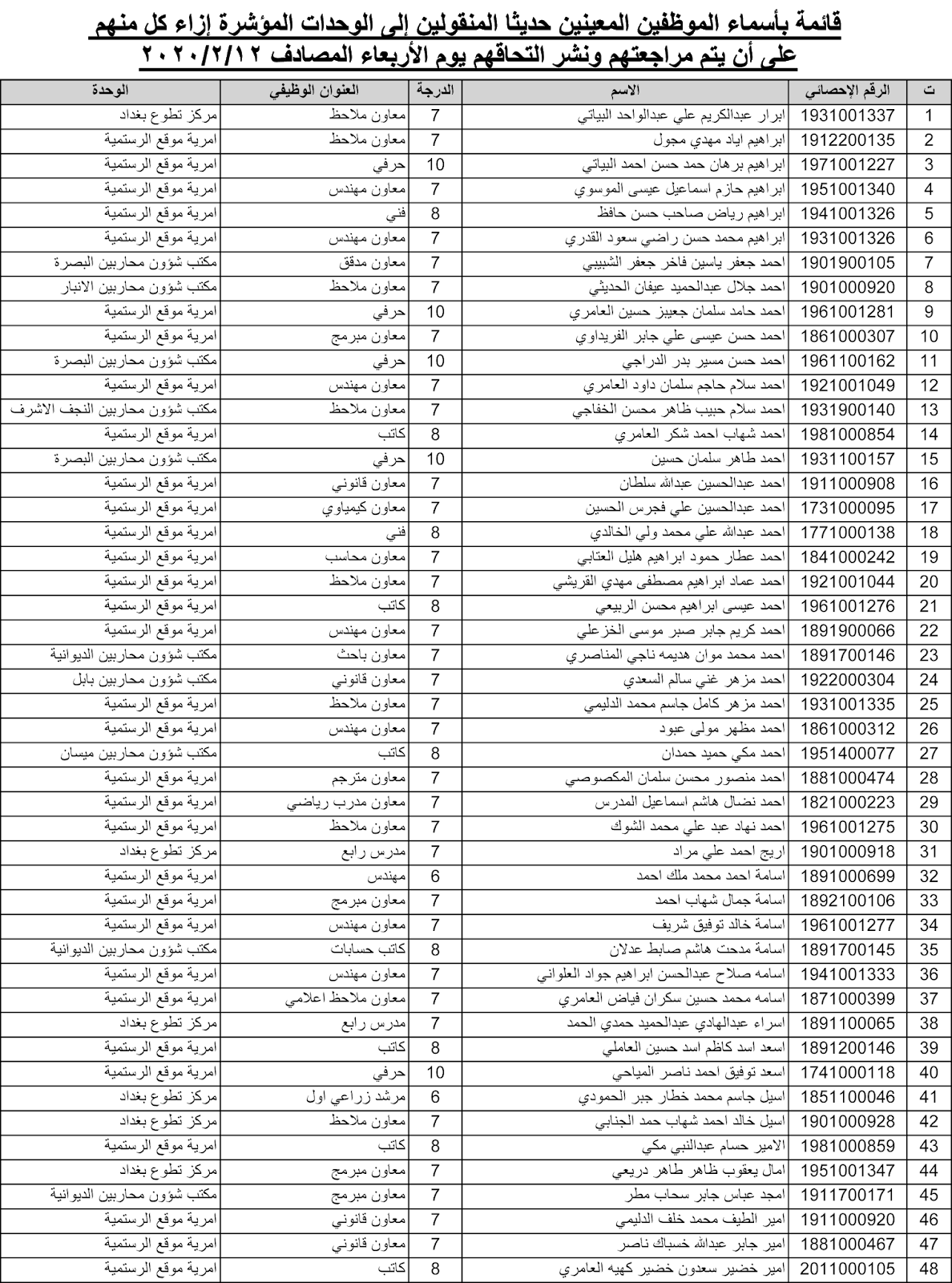 - انتهاء اعمال التدقيق والمطابقة الخاصة بهم مع وزارة المالية صدر الامر الاداري (278) الخاص بنقلهم الى الاماكن المؤشرة ازاء كل منهم حسب الجدول المرفق ادناه ويكون التحاقهم اعتباراً من يوم الاربعاء الموافق 12 شباط 2020 حتماً.