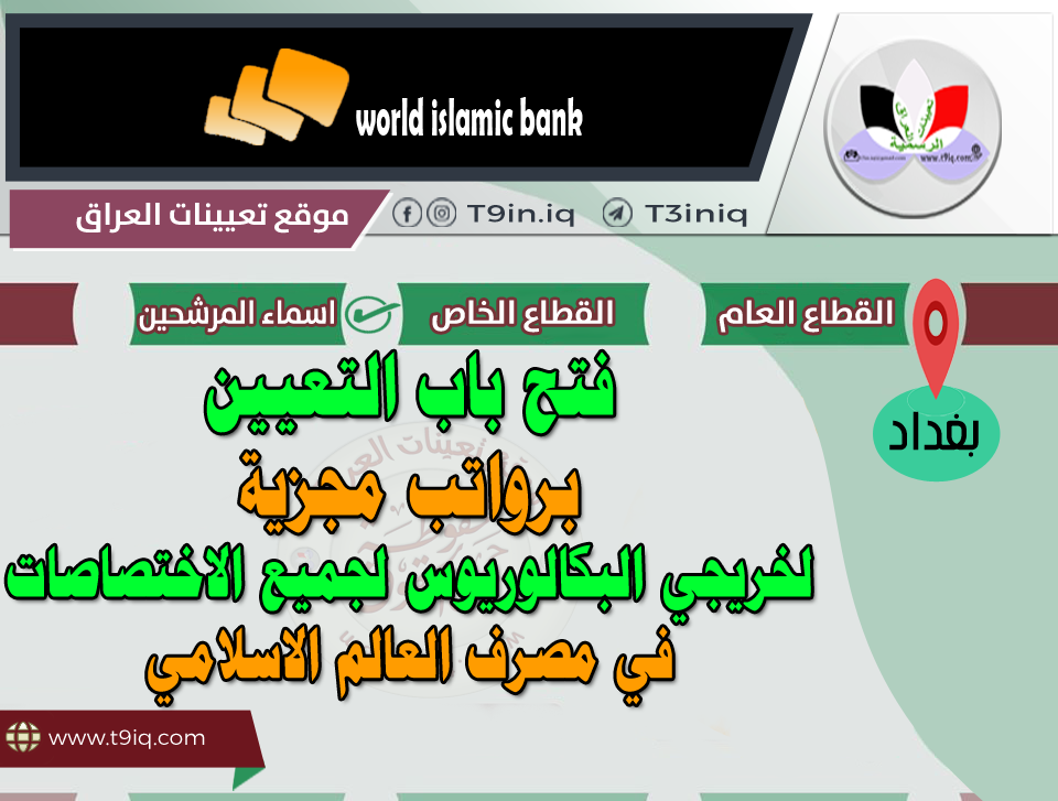 يعلن مصرف العالم الاسلامي ودعماً لخريجي البكالوريوس بجميع الاختصاصات عن فتح باب التعيين وبرواتب مجزية داخل المصرف وفقاً لمعلومات التقديم الموضحة أدناه :-