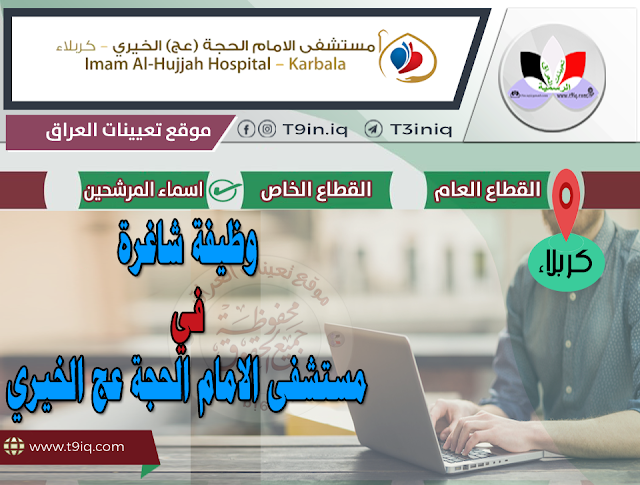 يسر مستشفى الامام الحجة (عج) الخيري ان يعلن عن توفر وظيفة شاغرة لجميع سكنة المحافظات وفقاً لشروط التقديم المعلنة أدناه :-