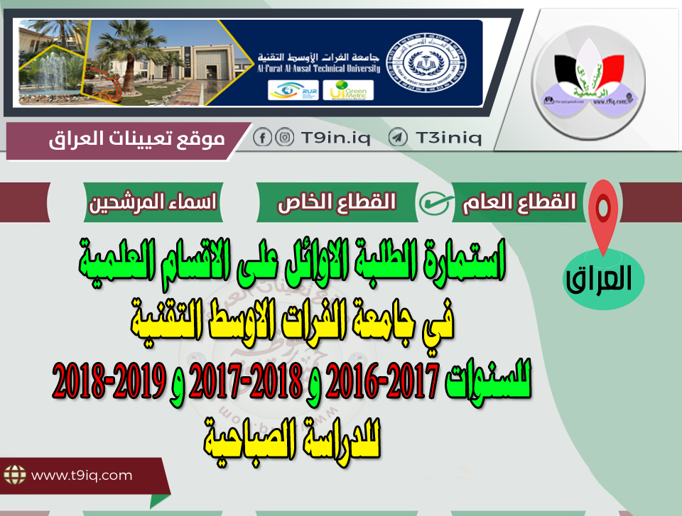 تعلن عمادة جامعة الفرات الاوسط التقنية عن اطلاق استمارة طلب تعيين الطلبة الاوائل خريجي السنوات (2016-2017) و (2017-2018) و (2018-2019) للدراسة الصباحية لذلك يرجى ملئ بيانات الاستمارة المدرجة ربطاً أدناه :-