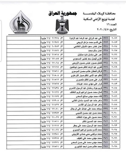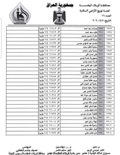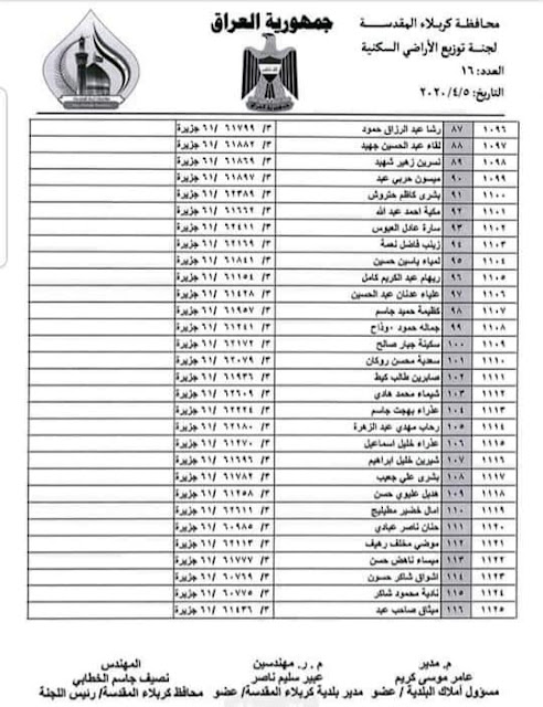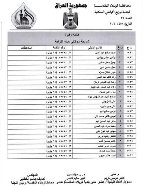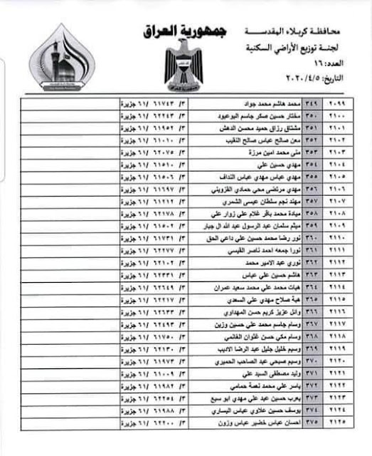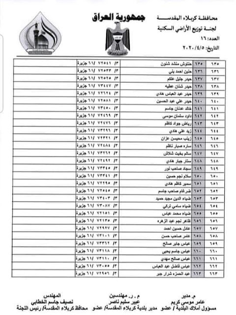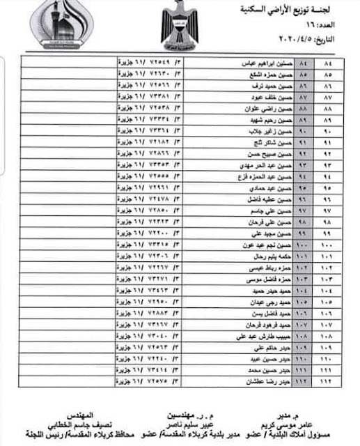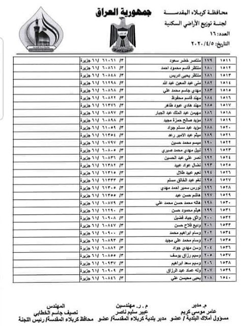 تعلن بلدية كربلاء المقدسة عن اسماء الفائزين بقطع الاراضي السكنية في محافظة كربلاء المقدسة لسنة 2020 المدرجة في القوائم أدناه :-