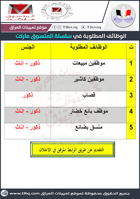 لقرب افتتاح سلسلة المتسوق ماركت نعلن عن توفر وظائف شاغرة لكلا الجنسين للإختصاصات المدرجة في المرفق مع التفاصيل إدناه :-