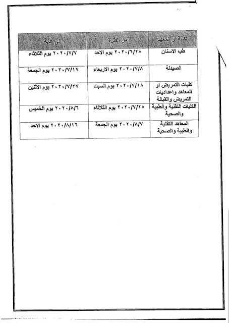 - يكون فتح الاستمارة الالكترونية ابتداءا من يوم الاحد المصادف 28/6/2020 وحسب الجدول الزمني المرفق ادناه.