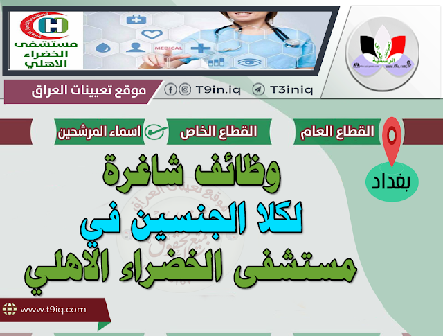 وظائف شاغرة لكلا الجنسين في مستشفى الخضراء الاهلي وفقاً للعناوين الوظيفية المدرجة أدناه :-