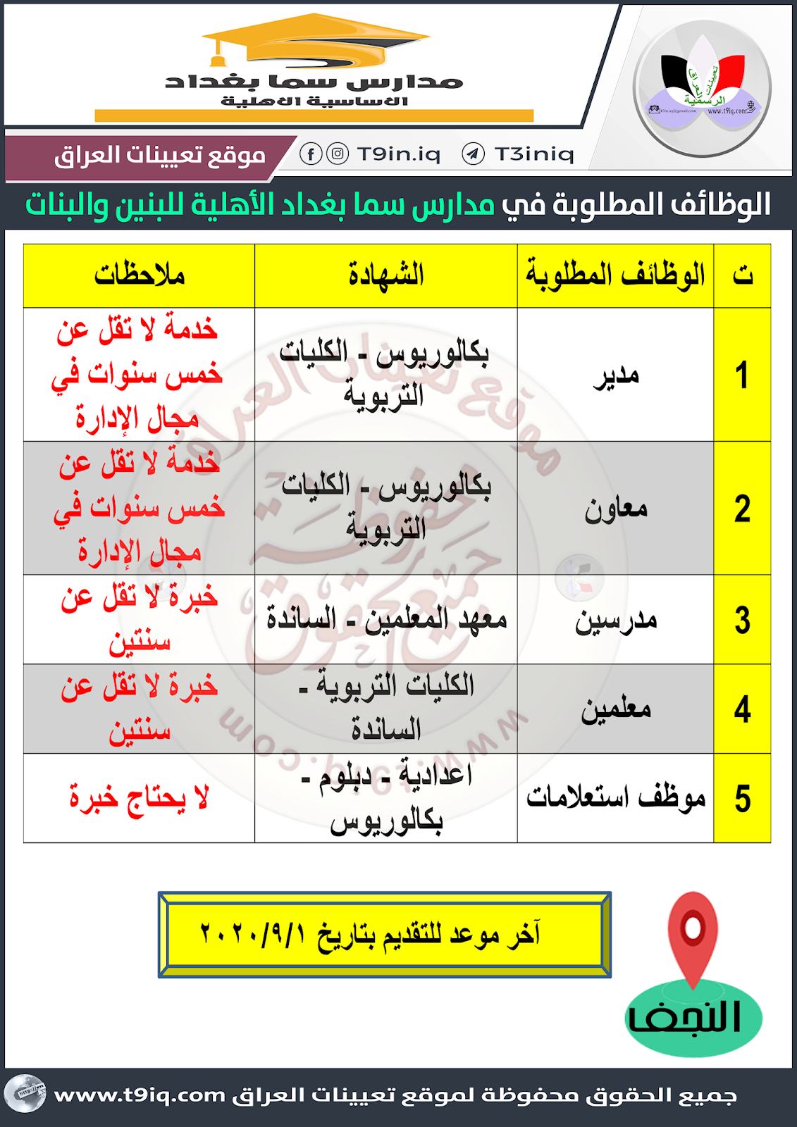 تعلن مجموعة مدارس سما بغداد الأهلية للبنين والبنات عن فتح باب التقديم للوظائف المدرجة في الجدول مع التفاصيل أدناه :-