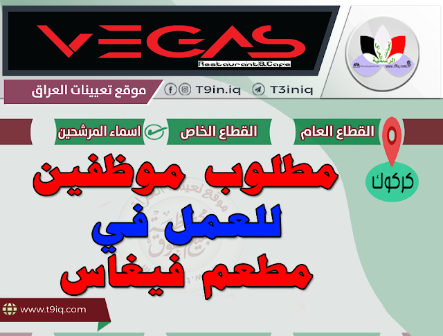 بسبب عملية التوسع تعلن إدارة مطعم فيغاس عن حاجتها إلى موظفين وفقاً للتفاصيل وعملية التقديم ادناه :-