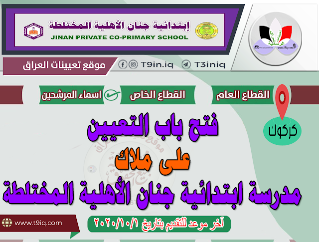 فتح باب التعيين على ملاك مدرسة ابتدائية جنان الاهلية المختلطة وفقاً للوظائف المذكورة أدناه :-