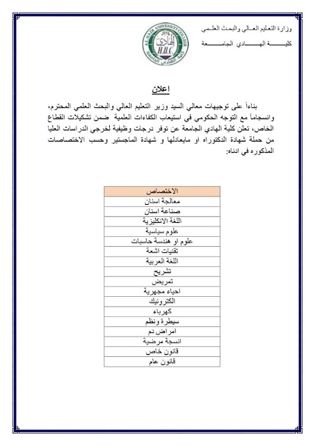 بناءً على توجيهات معالي السيد وزير التعليم العالي والبحث العلمي المحترم وانسجاماً مع التوجيه الحكومي تعلن كلية الهادي الجامعة عن فتح باب التعيين لإصحاب الشهادات العليا على ملاك الجامعة وفقاً للاختصاصات المدرجة في الجدول مع التفاصيل أدناه :-