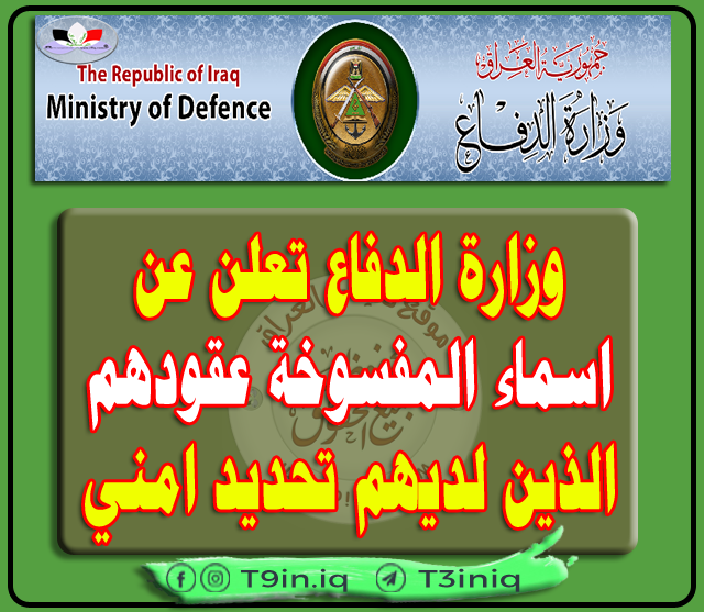 وزارة الدفاع تعلن عن اسماء المفسوخة عقودهم الذين لديهم تحديد امني وتدعوهم إلى مراجعة مركز تطوع بغداد لاجراء المقابلة اعتباراً من (1/10/2020 ولغاية 1/11/2020) لغرض تدقيق معلوماتهم وحسب قوائم الاسماء وجدول المواعيد المرفقة ربطاً ادناه :-