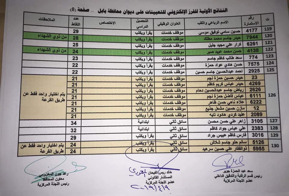 يعلن ديوان محافظة بابل عن اسماء المرشحين للتعيين على ملاك المحافظة للدرجات الوظيفية التي تم إطلاقها ضمن درجات الحذف والاستحداث وكما مدرجة في القوائم أدناه :-