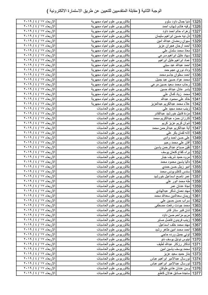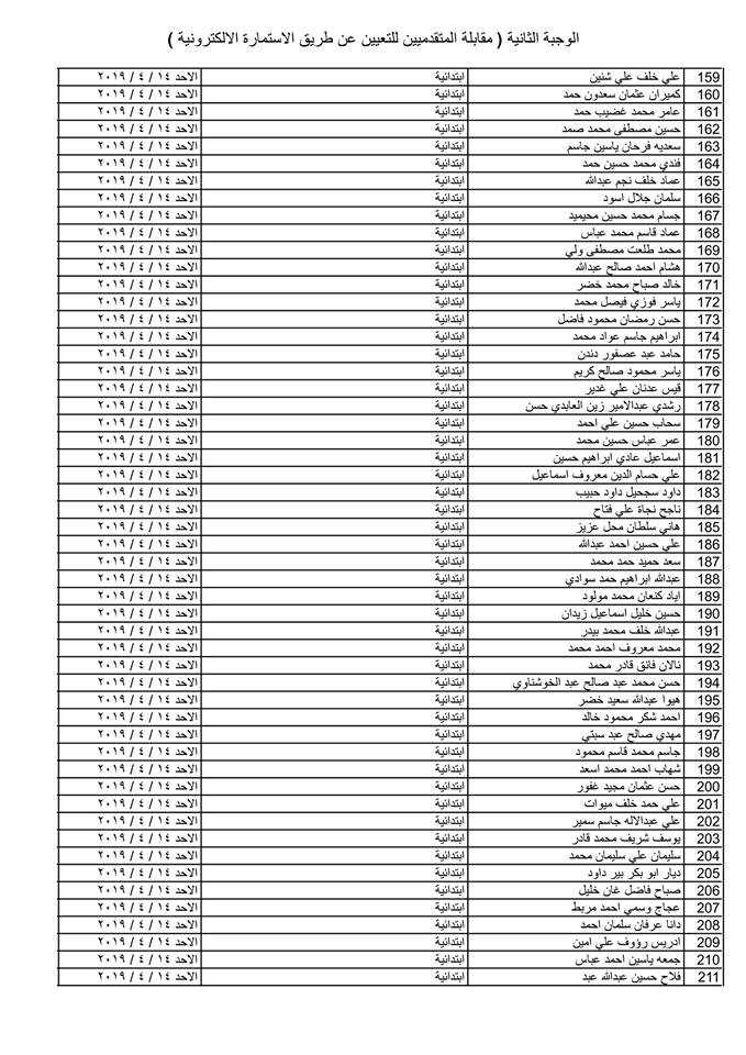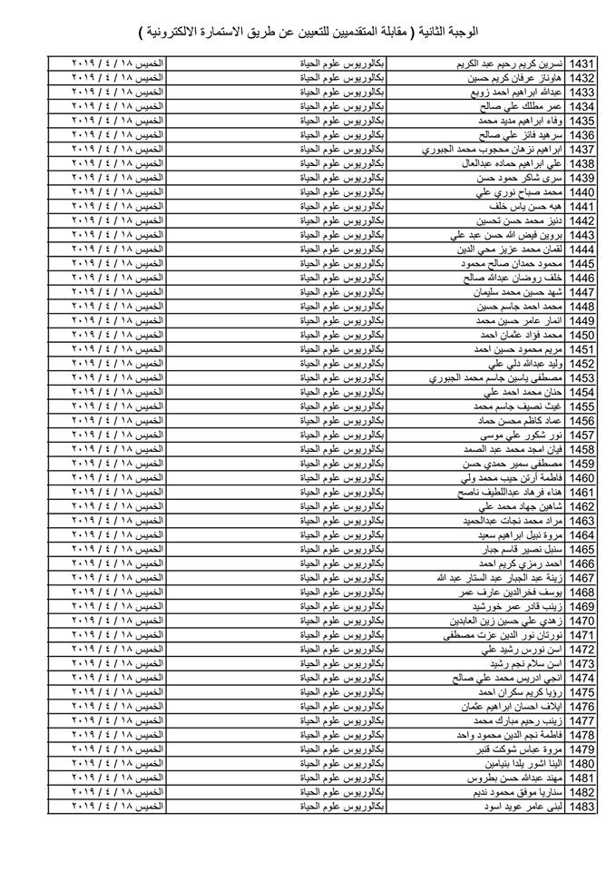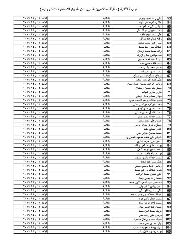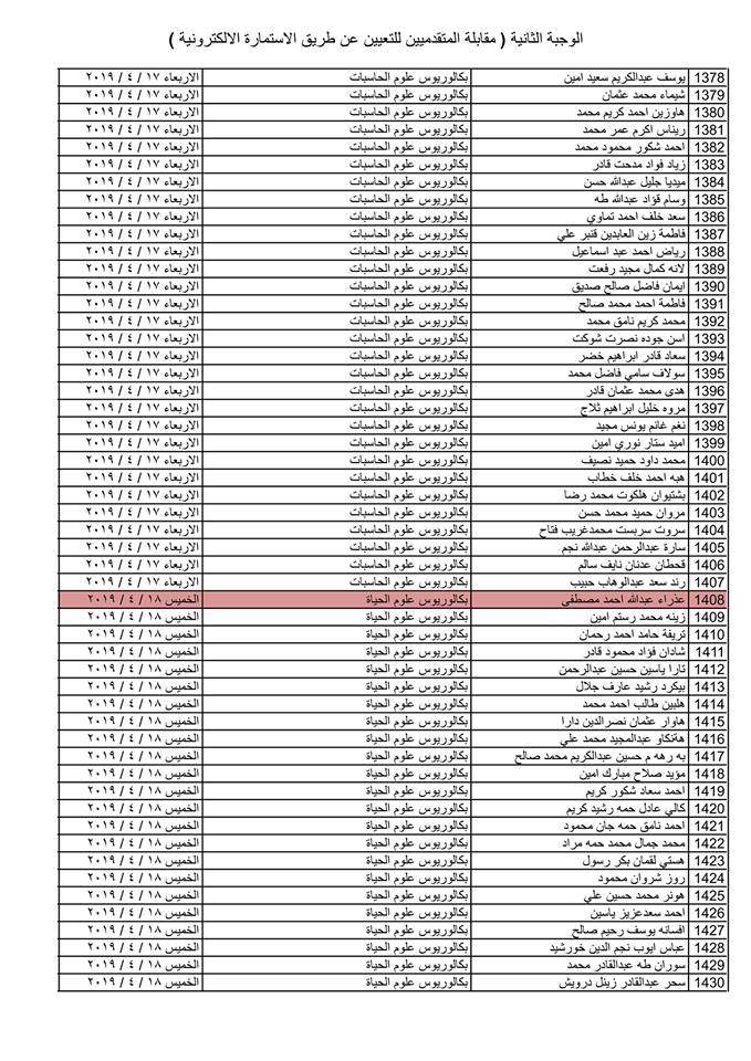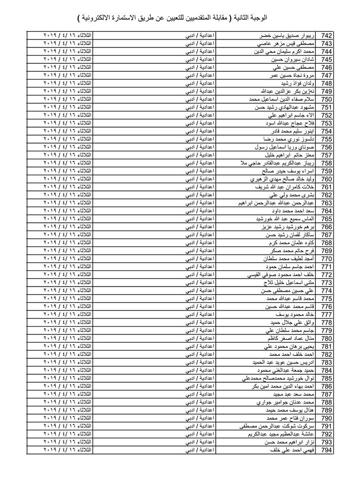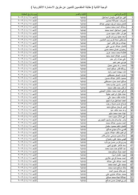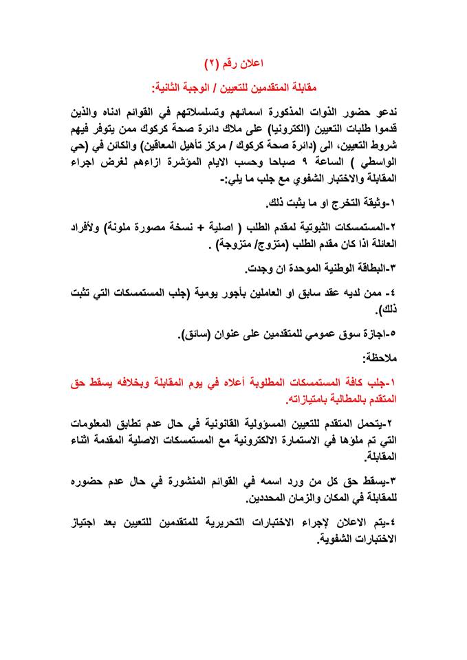 تدعو دائرة صحة كركوك الذوات المذكورة أسماؤهم وتسلسلاتهم وموعد المقابلة في القوائم المدرجة مع التفاصيل أدناه ( الوجبة الثانية ) الذين قدموا طلبات التعيين (الكترونيا) على ملاك دائرة صحة كركوك ممن يتوفر فيهم شروط التعيين لغرض إجراء المقابلة والاختبار الشفوي :-