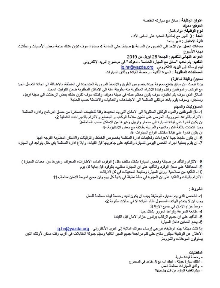 * للتقديم/ إرسال السيرة الذاتية مع كتابة ( سائق مع السيارة الخاصة - دهوك ) في خانة الموضوع إلى الايميل التالي :