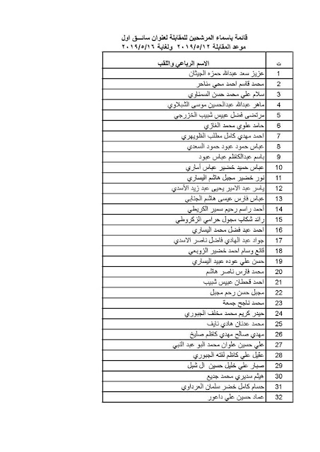 تعلن مديرية زراعة كربلاء المقدسة عن موعد الاختبار والمقابلة للمرشحين على الدرجات الوظيفية التي أعلنت سابقاً والمدرجة اسمائهم مع التفاصيل في القوائم أدناه :-