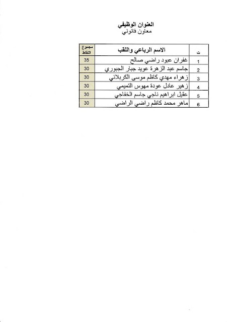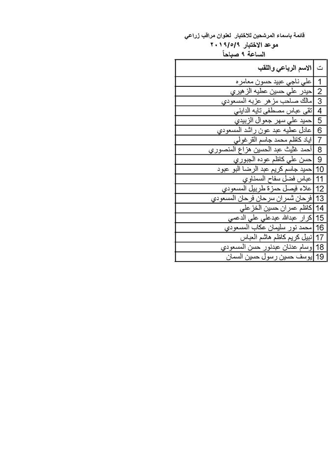 اولا/ على الذوات المدرجة اسماؤهم في القائمتين المرفقة طيا مراجعة مديرية زراعة محافظة كربلاء المقدسة / لجنة التعيينات مع جلب المستمسكات المطلوبة لعنوان معاون قانوني و معاون ملاحظ ( لغة عربية ) للفترة من 7/5/2019 ولغاية 13/5/2019 .