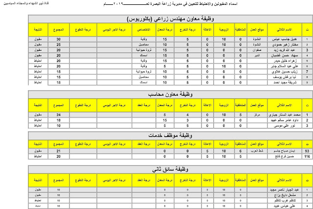 تعلن مديرية زراعة البصرة عن اسماء المقبولين للتعيين والاحتياط من المتقدمين على الدرجات الوظيفية على ملاك المديرية حسب القوائم المدرجة مع التفاصيل أدناه :-