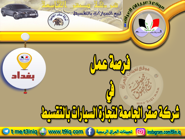 تعلن شركة صقر الجامعة لتجارة السيارات بالتقسيط عن توفر فرصة عمل وفقاَ للشروط المدرجة ادناه :-