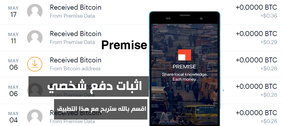 premise هو تطبيق ربحي جديد يدفع للأشخاص الذين يرغبون بكسب المال عن طريق أكمال المهام التي يطلبها منك، هذا المهام تختلف من دولة الى أخرى منها أكمال الاستبيانات والتقاط صور معينة لبعض المناطق المجاورة منك والأجابة على بعض الأسئلة وأخذ صور لمدينتك، التطبيق مضمون وصادق 100% مع أثبات دفع شخصي بأكثر من 2$ خلال اسبوعان على محفظة coinbase،التطبيق يوفر لك ميزة الربح عن طريق الأجابة على الأسئلة والربح من استطلاعات الرأي مع سحب الأرباح على عن طريق البتكوين او تعبئة الرصيد.